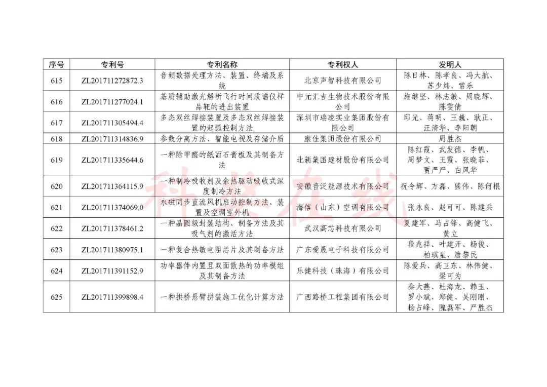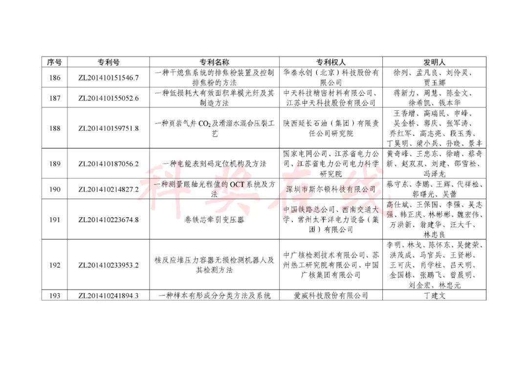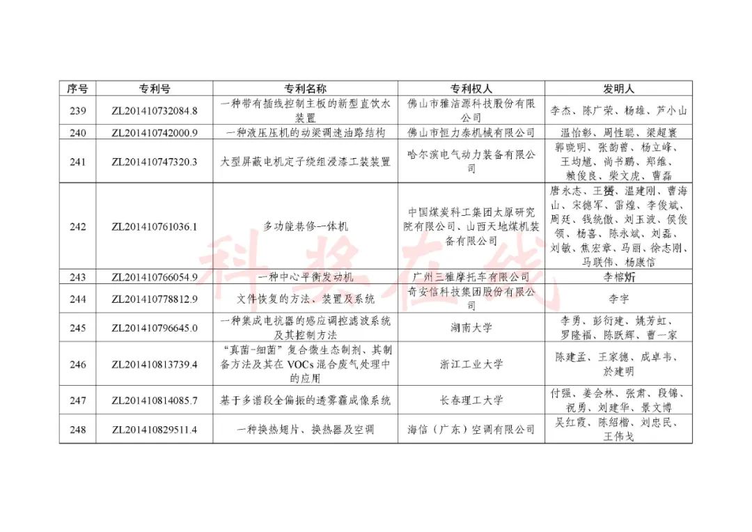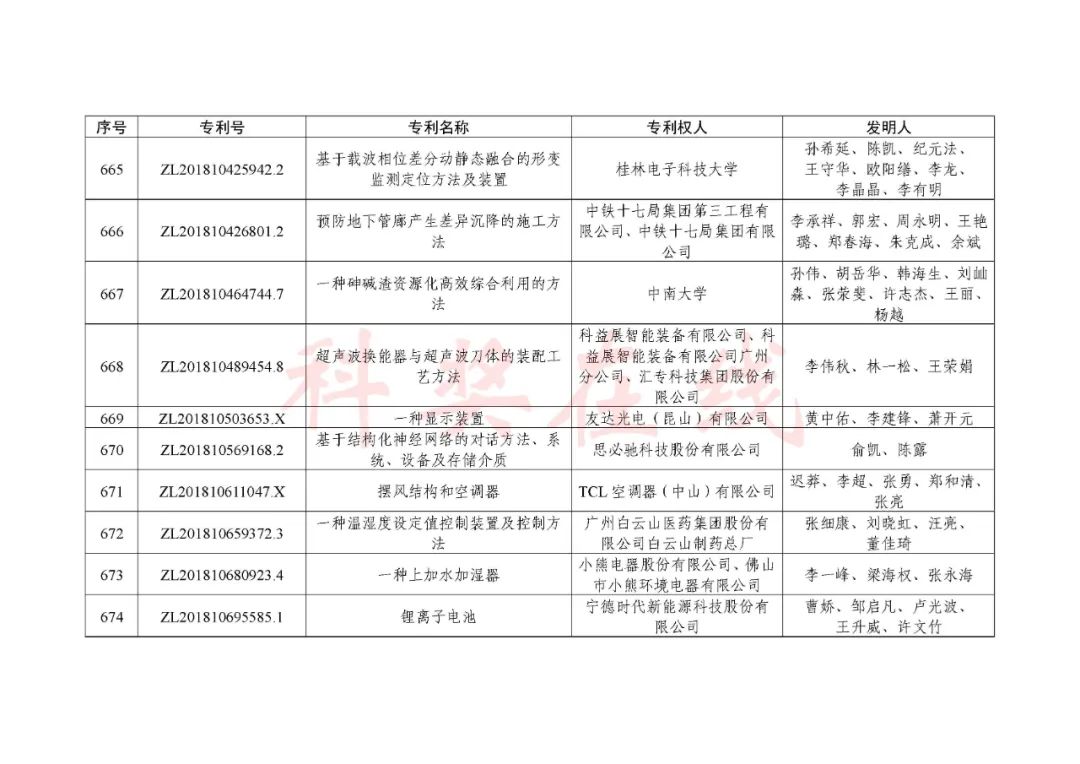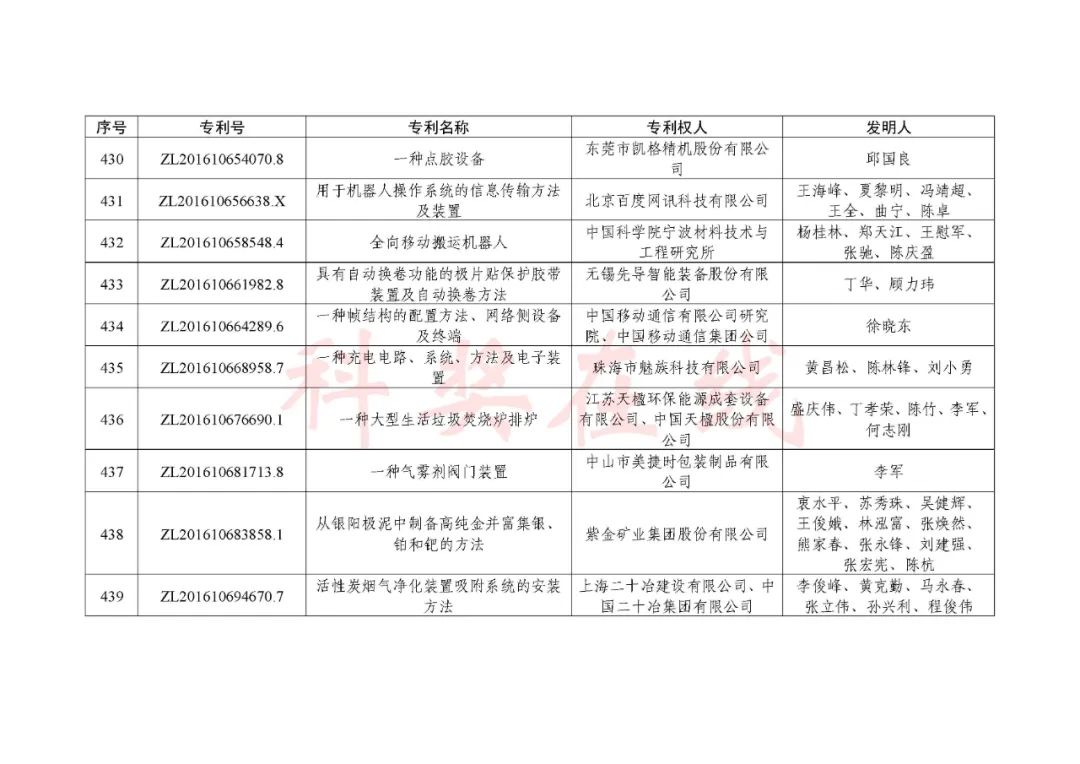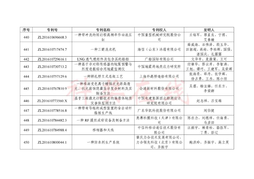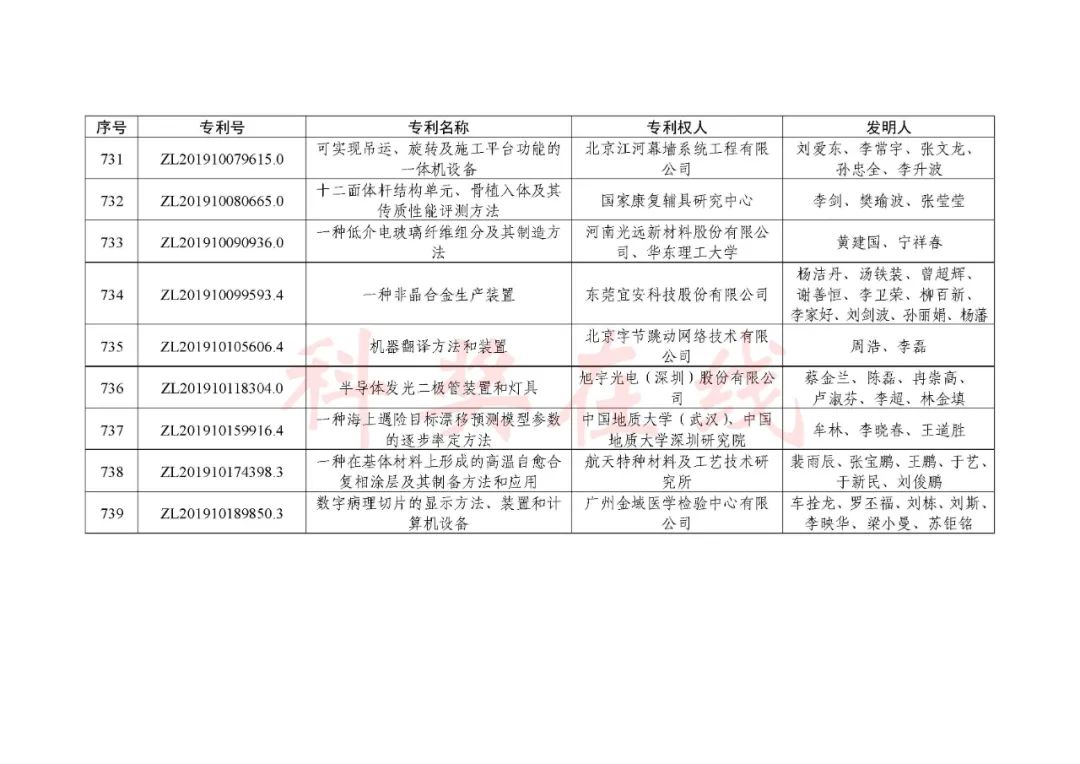 根据《中国专利奖评奖办法》规定,经国务院有关部门知识产权工作管理机构、地方知识产权局、有关全国性行业协会,以及中国科学院院士和中国工程院院士等推荐,中国专利奖评审委员会评审,社会公示,国家知识产权局和世界知识产权组织决定授予“丁苯酞环糊精或环糊精衍生物包合物及其制备方法和用途”等30项发明、实用新型专利中国专利金奖,“伽马刀”等10项外观设计专利中国外观设计金奖;国家知识产权局决定授予“一种治疗小儿食积咳嗽的中药组合物及其制备方法”等60项发明、实用新型专利中国专利银奖,“中子活化多元素分析仪”等15项外观设计专利中国外观设计银奖;国家知识产权局决定授予“有效部位药物沉积得到改善的干粉组合物”等791项发明、实用新型专利中国专利优秀奖,“LED庭院灯(中式)”等52项外观设计专利中国外观设计优秀奖;国家知识产权局决定授予江苏省知识产权局等8家单位中国专利奖最佳组织奖,中国科学院科技促进发展局等20家单位中国专利奖优秀组织奖,舒兴田等18位院士中国专利奖最佳推荐奖。