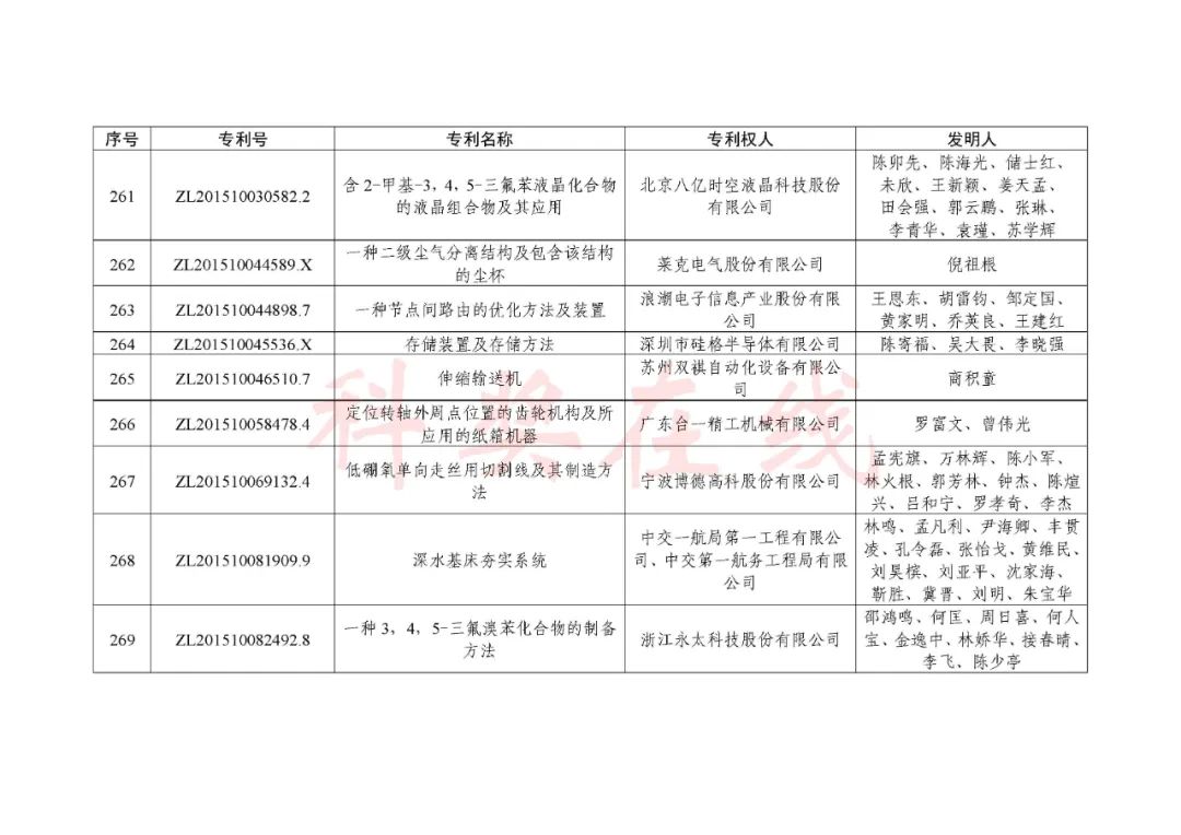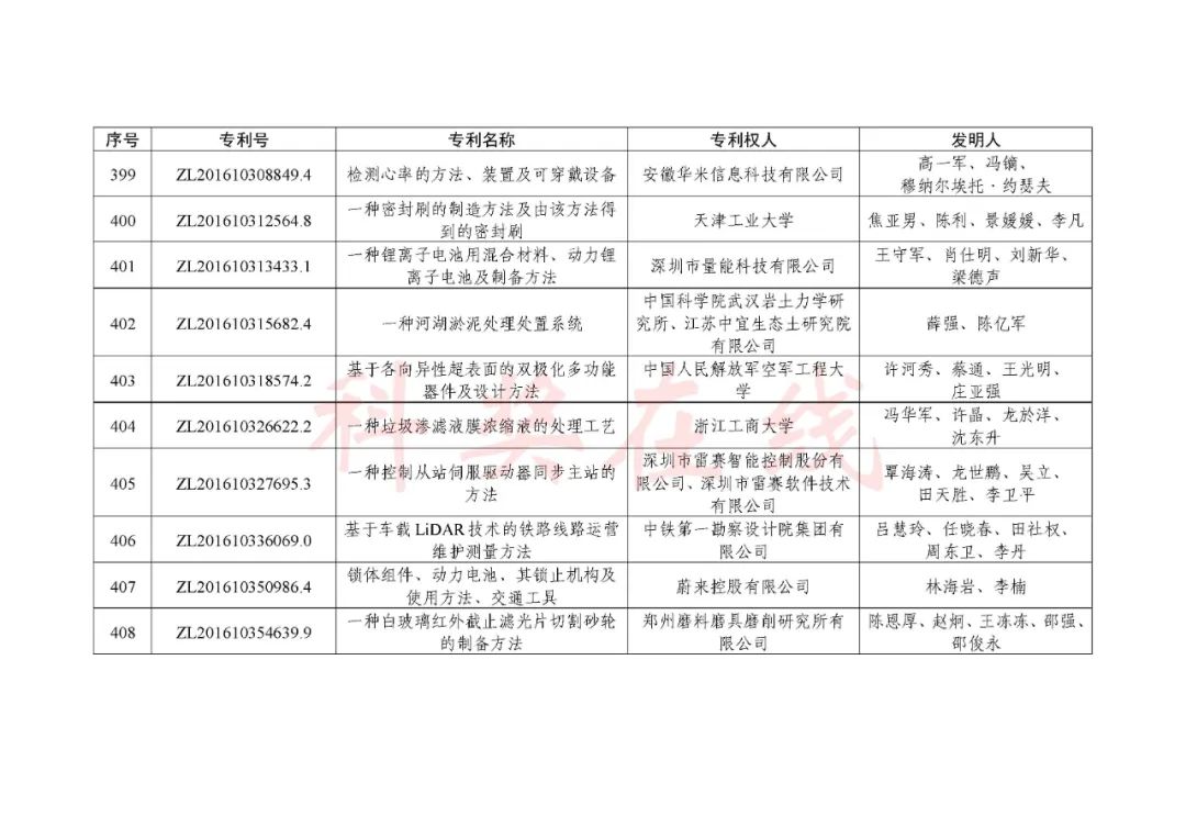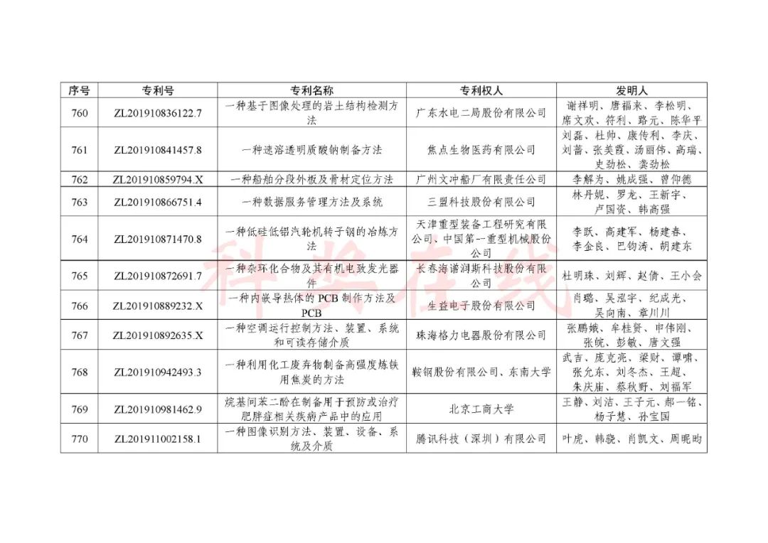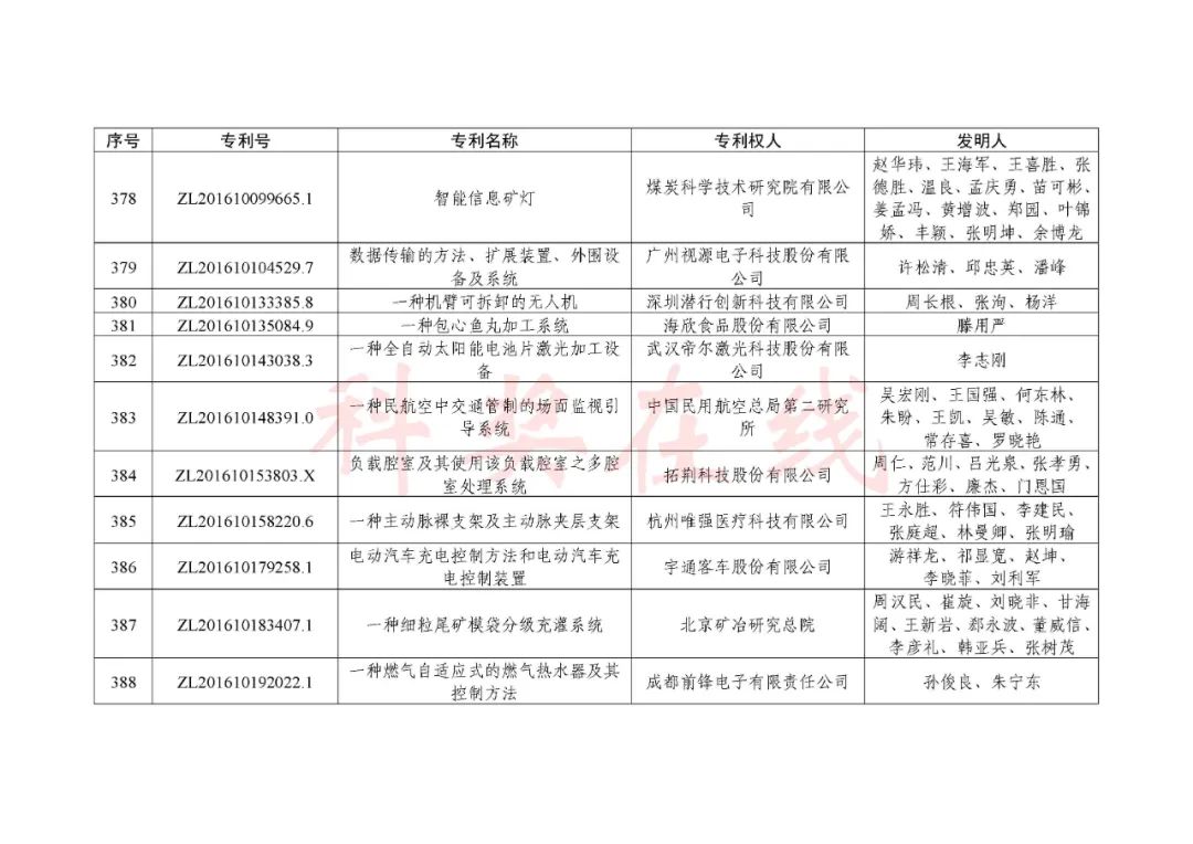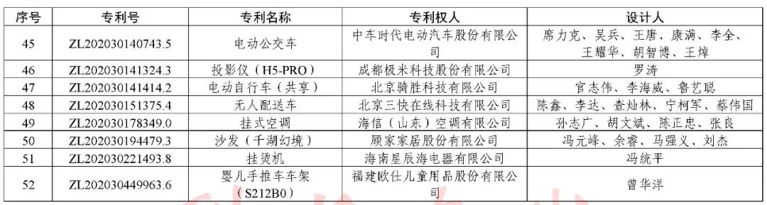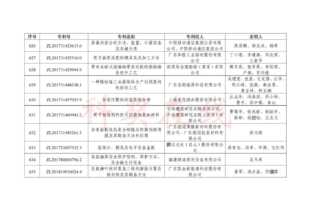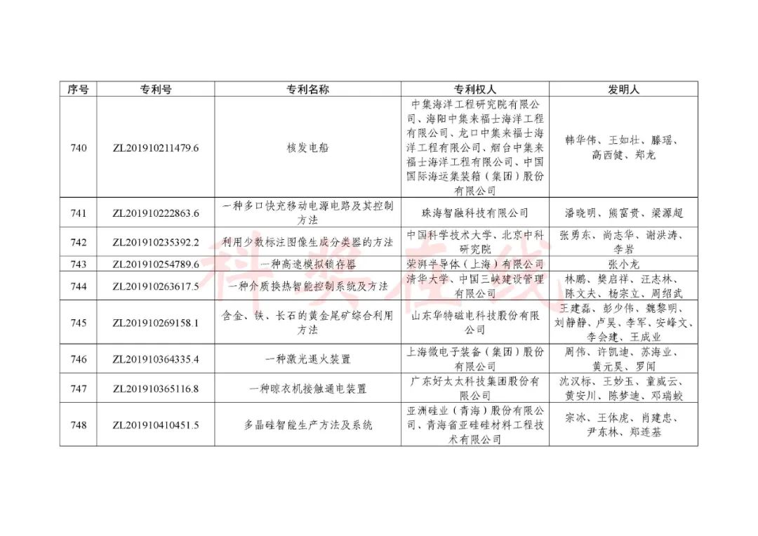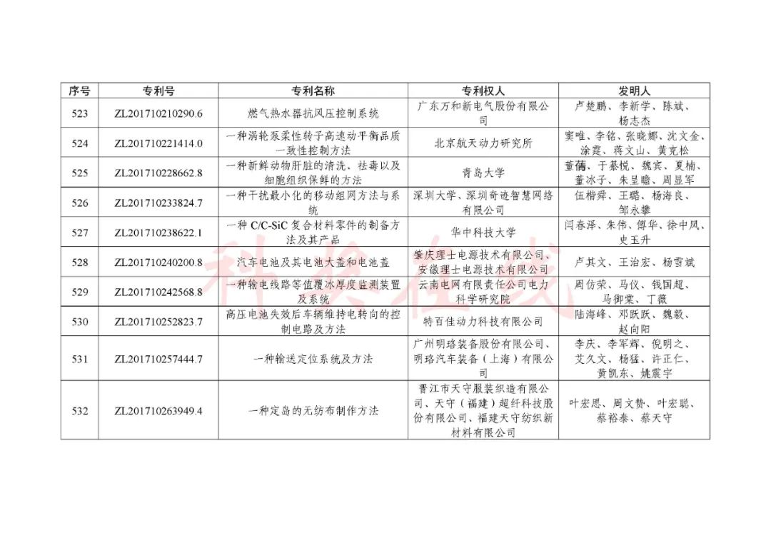 根据《中国专利奖评奖办法》规定,经国务院有关部门知识产权工作管理机构、地方知识产权局、有关全国性行业协会,以及中国科学院院士和中国工程院院士等推荐,中国专利奖评审委员会评审,社会公示,国家知识产权局和世界知识产权组织决定授予“丁苯酞环糊精或环糊精衍生物包合物及其制备方法和用途”等30项发明、实用新型专利中国专利金奖,“伽马刀”等10项外观设计专利中国外观设计金奖;国家知识产权局决定授予“一种治疗小儿食积咳嗽的中药组合物及其制备方法”等60项发明、实用新型专利中国专利银奖,“中子活化多元素分析仪”等15项外观设计专利中国外观设计银奖;国家知识产权局决定授予“有效部位药物沉积得到改善的干粉组合物”等791项发明、实用新型专利中国专利优秀奖,“LED庭院灯(中式)”等52项外观设计专利中国外观设计优秀奖;国家知识产权局决定授予江苏省知识产权局等8家单位中国专利奖最佳组织奖,中国科学院科技促进发展局等20家单位中国专利奖优秀组织奖,舒兴田等18位院士中国专利奖最佳推荐奖。