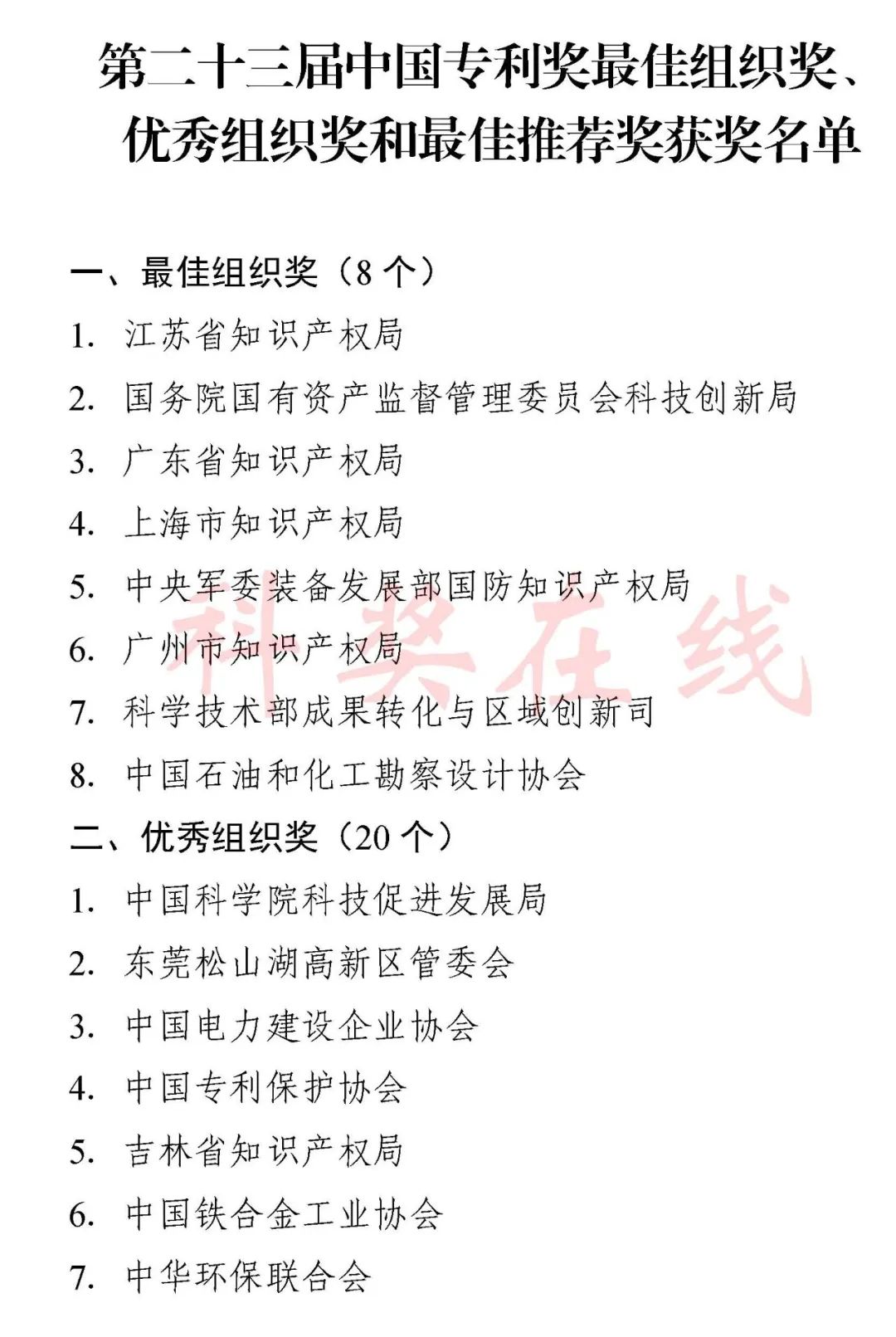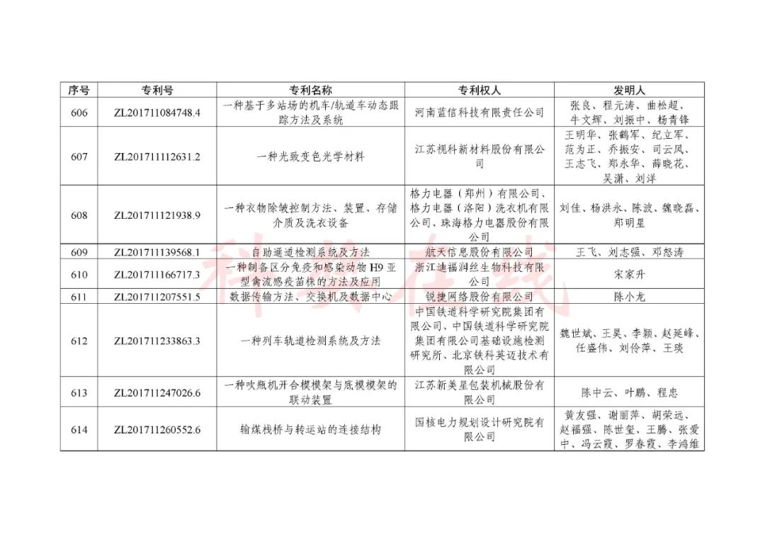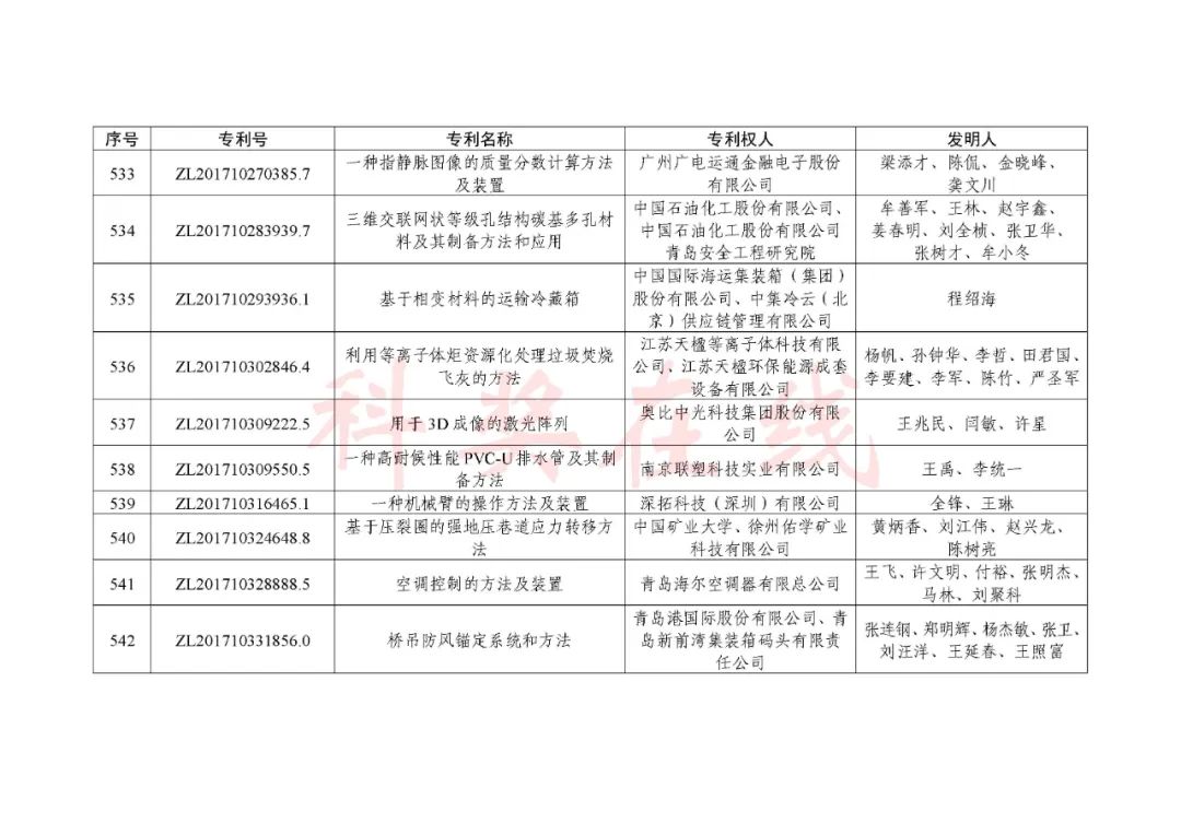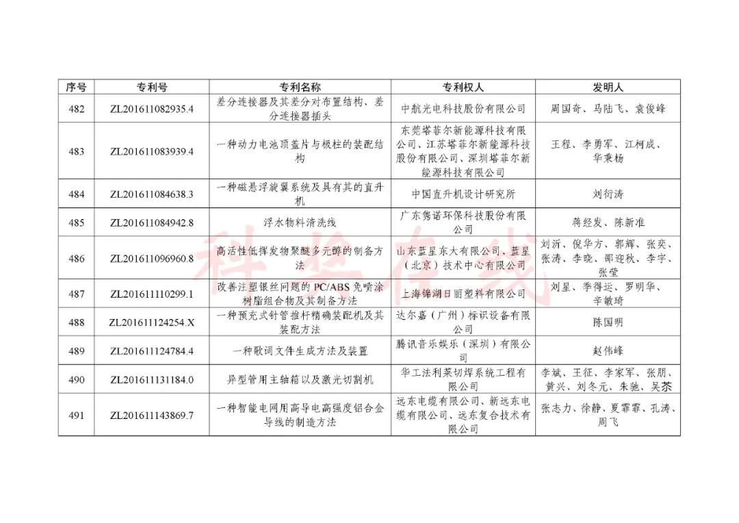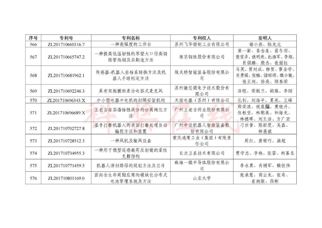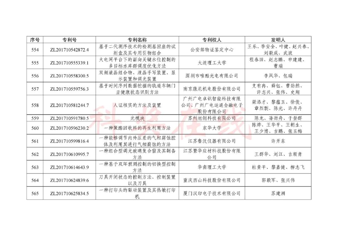 根据《中国专利奖评奖办法》规定,经国务院有关部门知识产权工作管理机构、地方知识产权局、有关全国性行业协会,以及中国科学院院士和中国工程院院士等推荐,中国专利奖评审委员会评审,社会公示,国家知识产权局和世界知识产权组织决定授予“丁苯酞环糊精或环糊精衍生物包合物及其制备方法和用途”等30项发明、实用新型专利中国专利金奖,“伽马刀”等10项外观设计专利中国外观设计金奖;国家知识产权局决定授予“一种治疗小儿食积咳嗽的中药组合物及其制备方法”等60项发明、实用新型专利中国专利银奖,“中子活化多元素分析仪”等15项外观设计专利中国外观设计银奖;国家知识产权局决定授予“有效部位药物沉积得到改善的干粉组合物”等791项发明、实用新型专利中国专利优秀奖,“LED庭院灯(中式)”等52项外观设计专利中国外观设计优秀奖;国家知识产权局决定授予江苏省知识产权局等8家单位中国专利奖最佳组织奖,中国科学院科技促进发展局等20家单位中国专利奖优秀组织奖,舒兴田等18位院士中国专利奖最佳推荐奖。