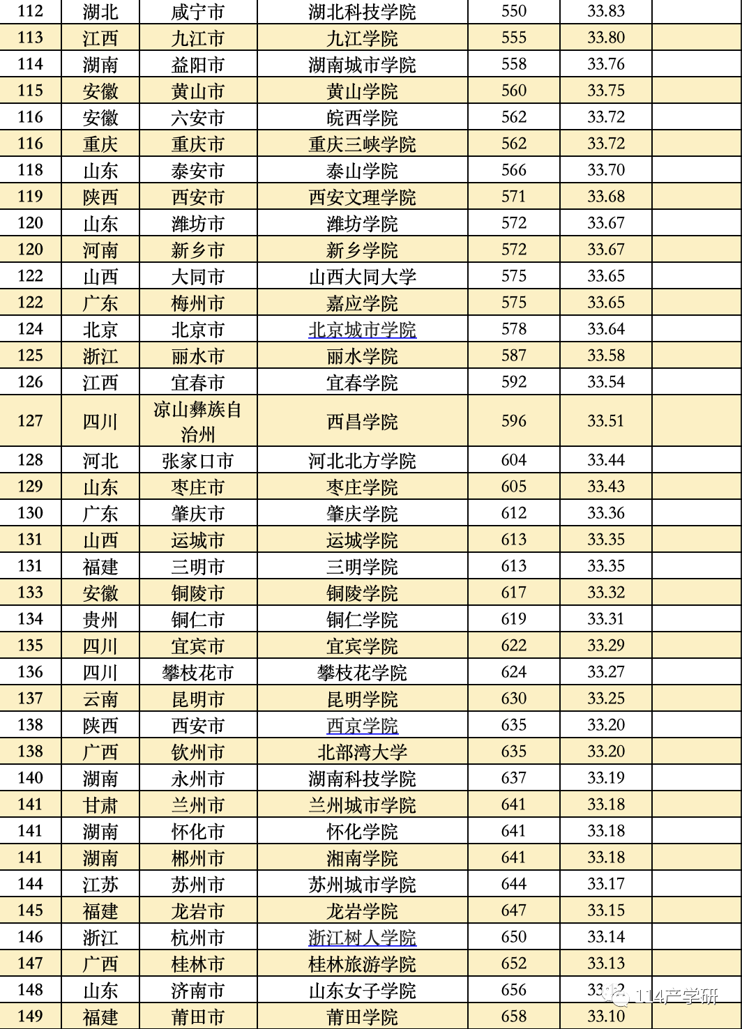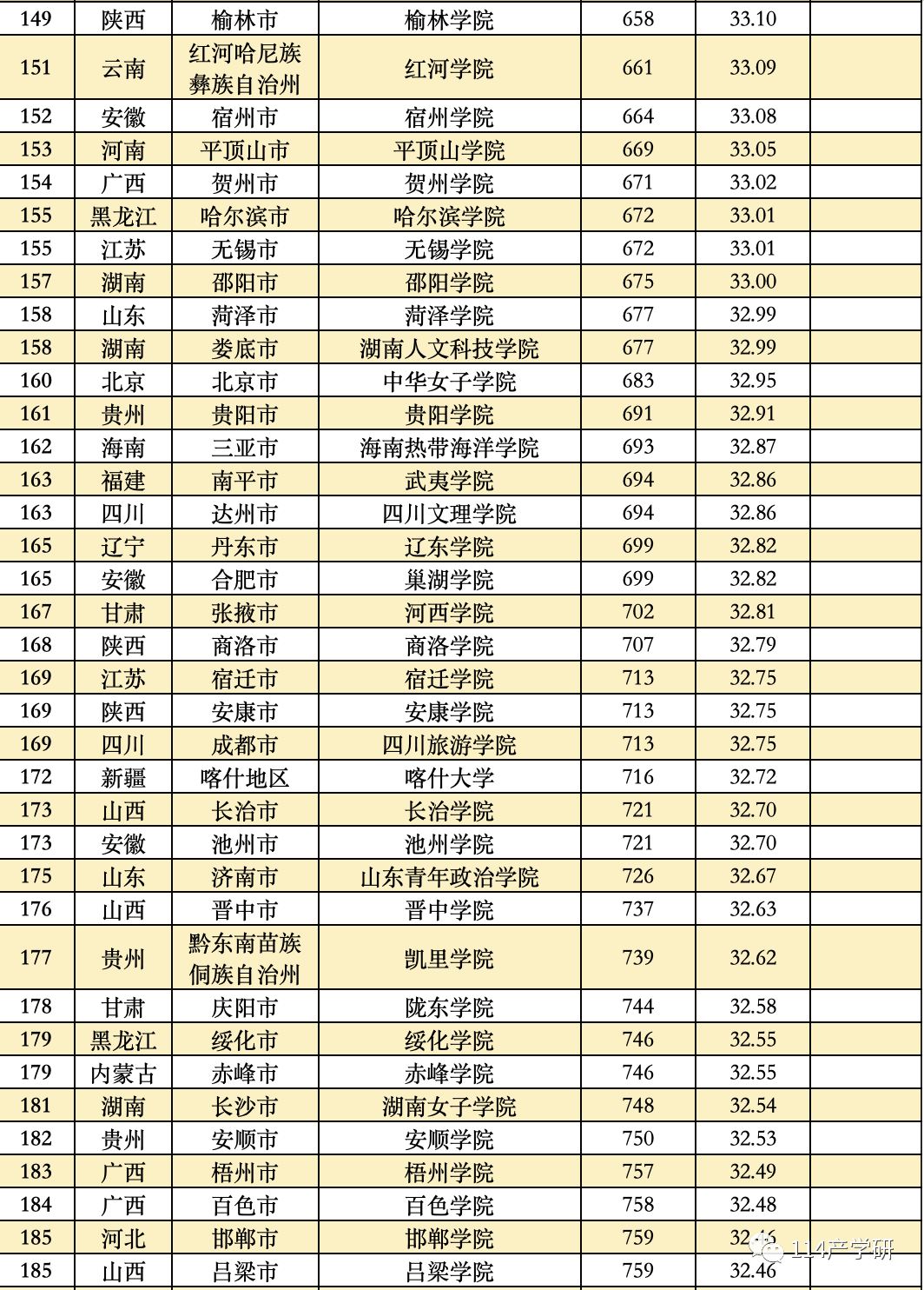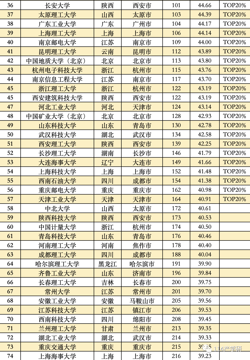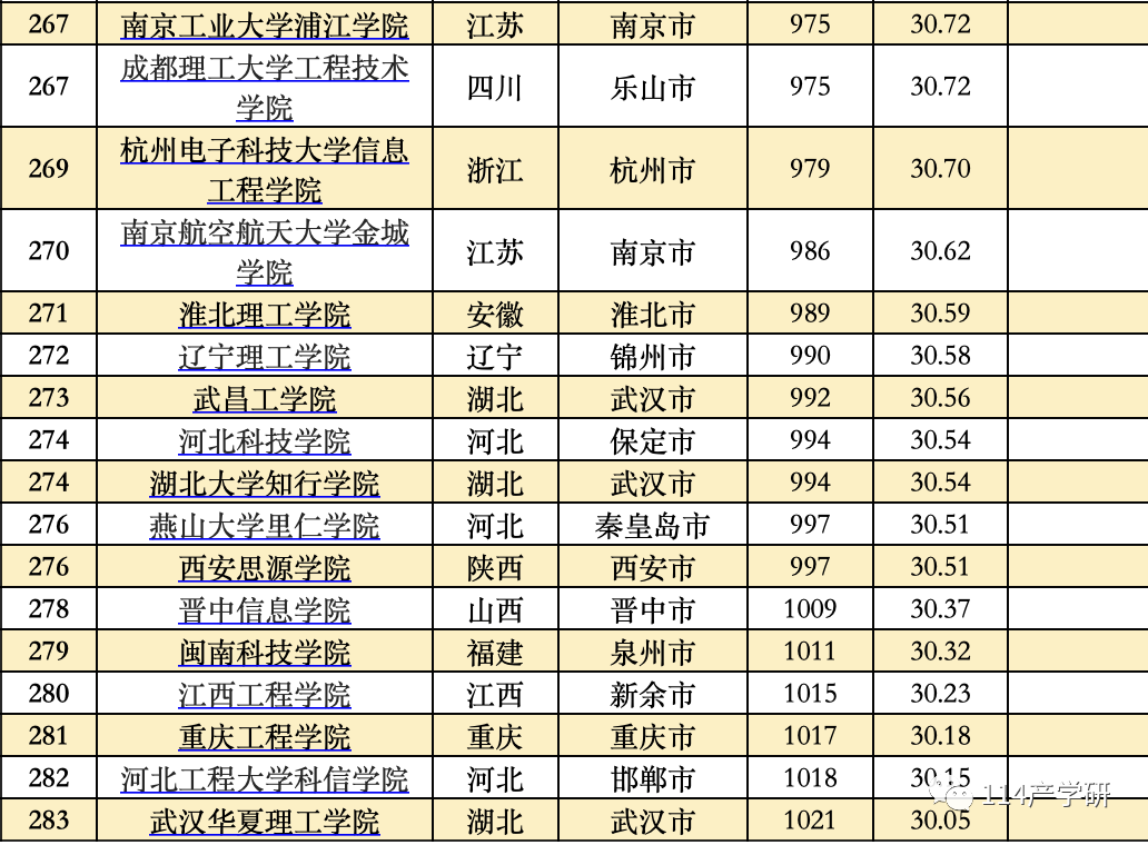 第三方指数计算了11大类高校的得分,按照不同类型的大学进行分别比较,并分别列出了11大类高校中得分排在前20%的高校名单。