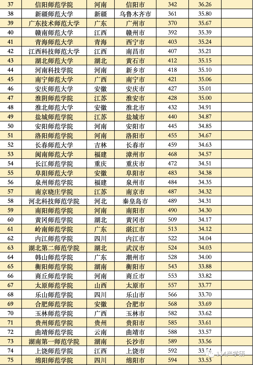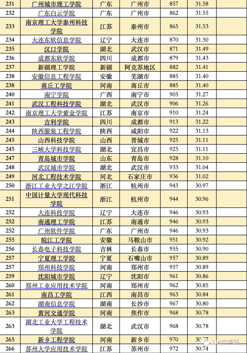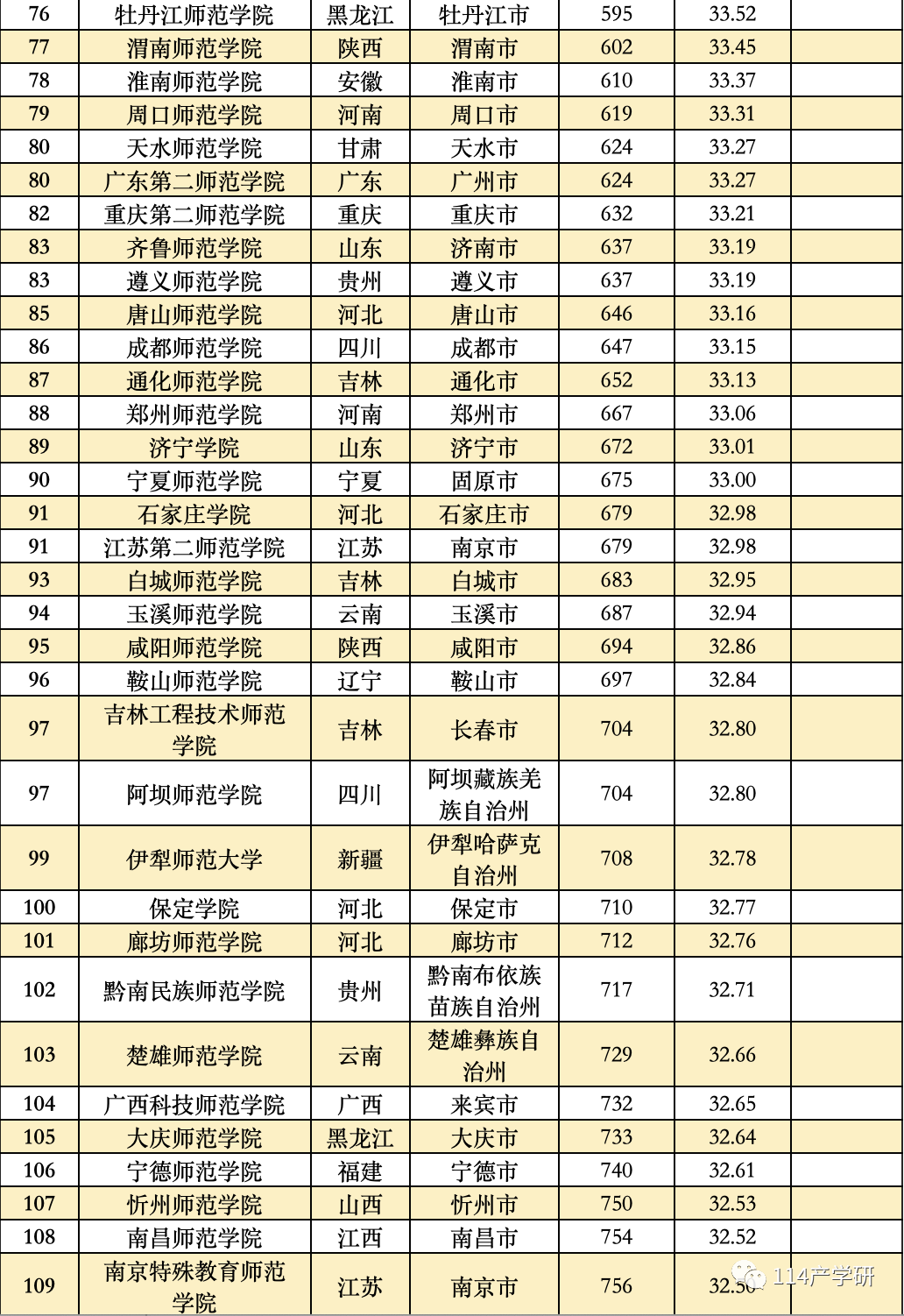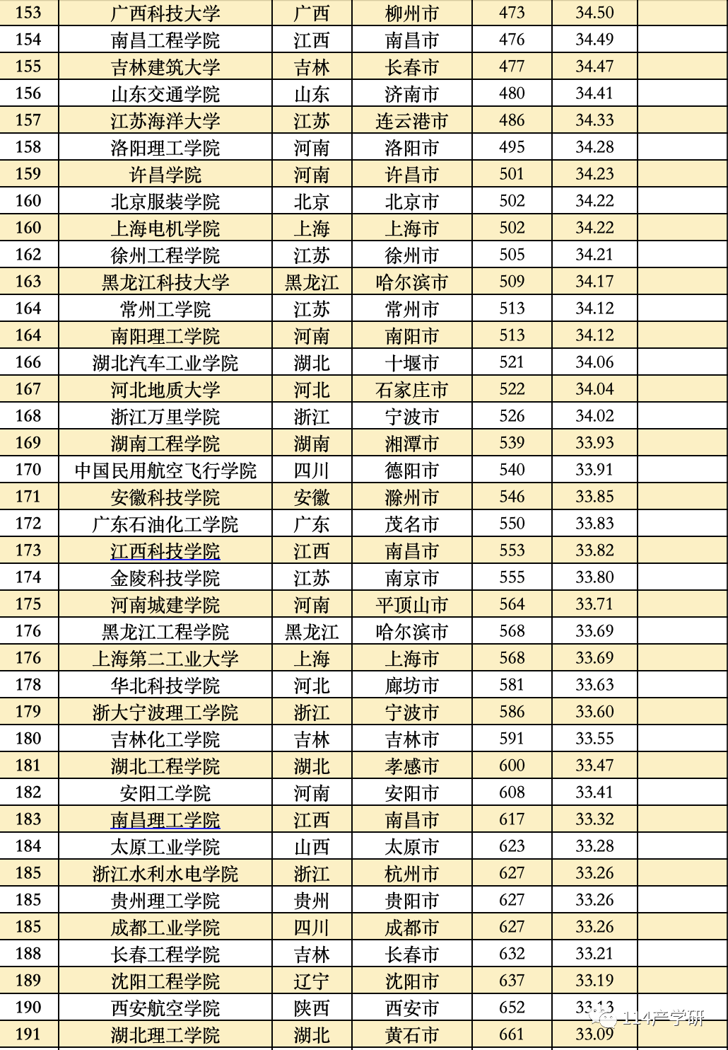 第三方指数计算了11大类高校的得分,按照不同类型的大学进行分别比较,并分别列出了11大类高校中得分排在前20%的高校名单。