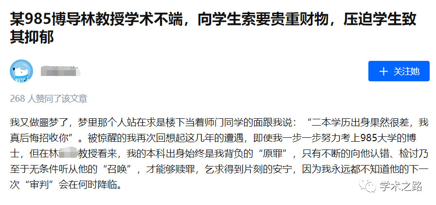 最近,知乎上如下一则帖子引发广泛关注,一名自称985高校博士生的网友,对导师质疑自身本科学历差、疑似挂名学生论文、要求自己干杂活等种种行为做出控诉。