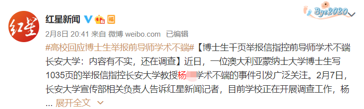 2月7日,长安大学宣传部相关负责人告诉红星新闻记者,目前学校正在开展调查工作,杨某也正在配合相关调查,但是因为举报信内容较多,所以很多地方还得进一步核实。
