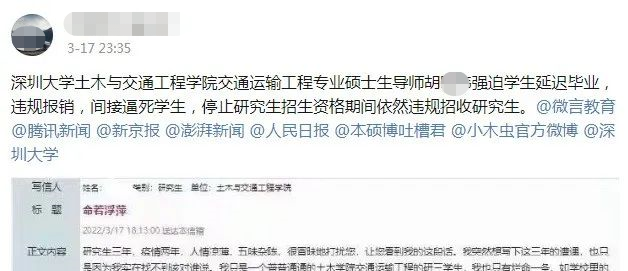 例如,2022年3月17日,微博上有一网友爆料称:深圳大学某学院硕士生导师胡某某强迫学生延迟毕业,违规报销,间接逼死学生,停止研究生招生资格期间依然违规招收研究生。