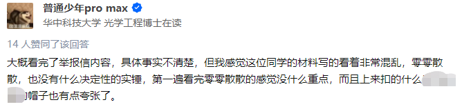 事后,经学术圈多人反映“本次举报信内容虽多,但质量堪忧”,完全不同于此前天津大学研究生吕翔以一篇长达123页实名举报信,条理清晰、证据有效,举报其原导师大量学术造假,后经学校调查予以解聘。