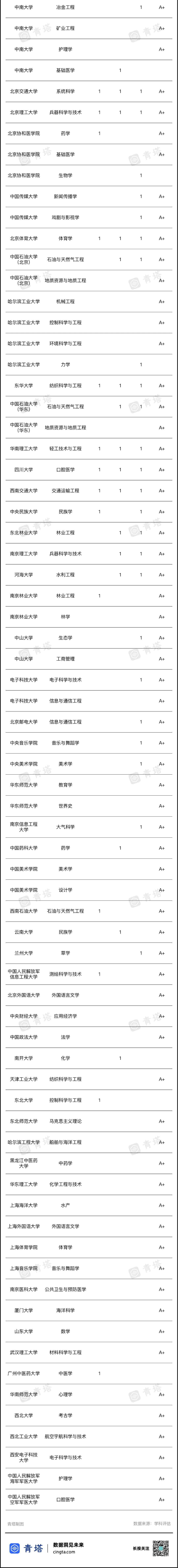 (注:第四轮学科评估结果不公布具体名次,结果按照“精准计算、分档呈现”的原则呈现,青塔此次仅统计A+学科情况;一级学科名称以最新版学科目录为主 )