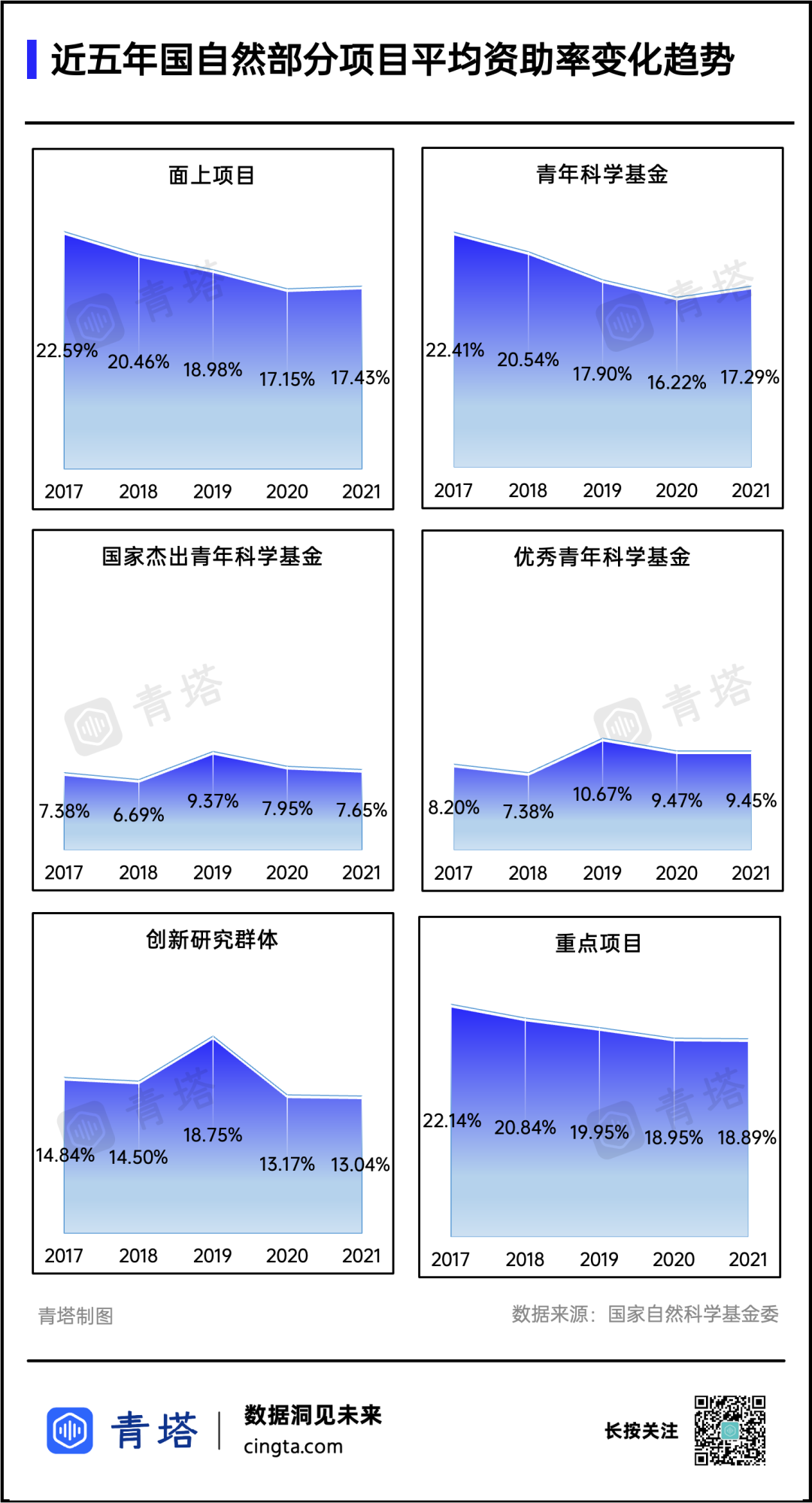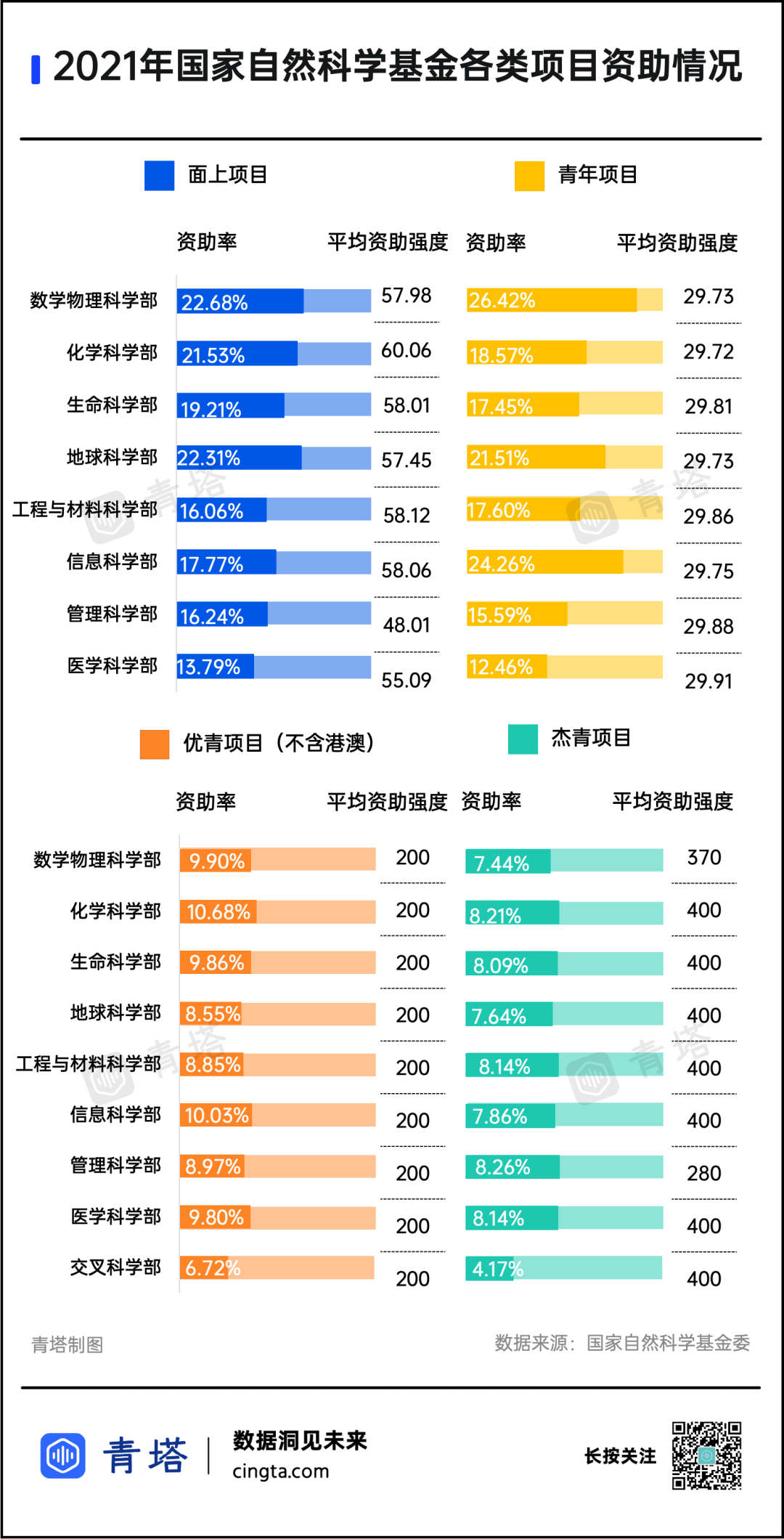 在2021年,自科基金面上项目的平均资助率是17.43%。数学物理科学部的资助率最高,达到22.68%;而医学科学部的资助率仅有13.79%,远远低于平均资助率。