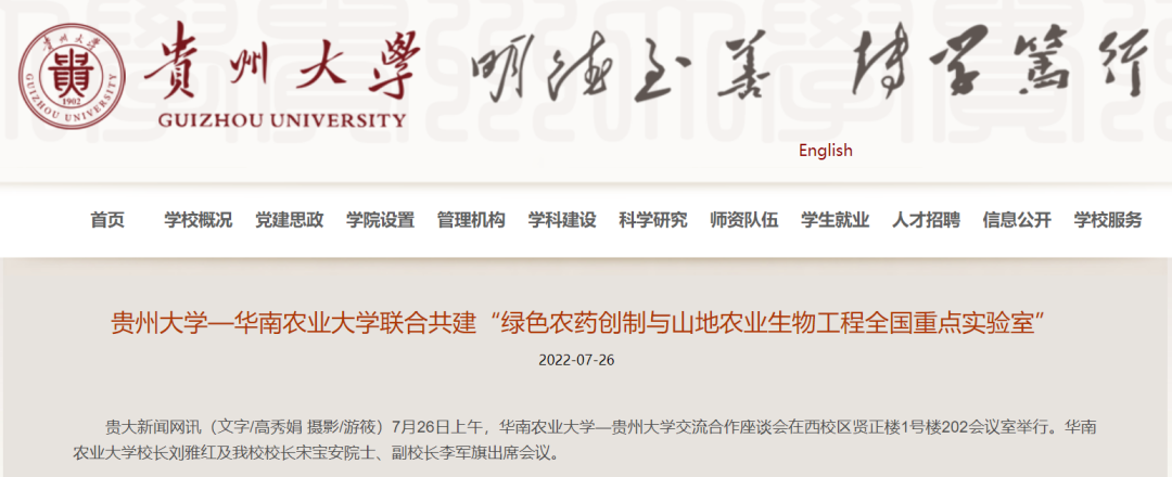 7月26日,为整合资源实现优势互补,进一步提升全国重点实验室的影响力,贵州大学与华南农业大学经过协商,决定联合共建“绿色农药创制与山地农业生物工程全国重点实验室”。