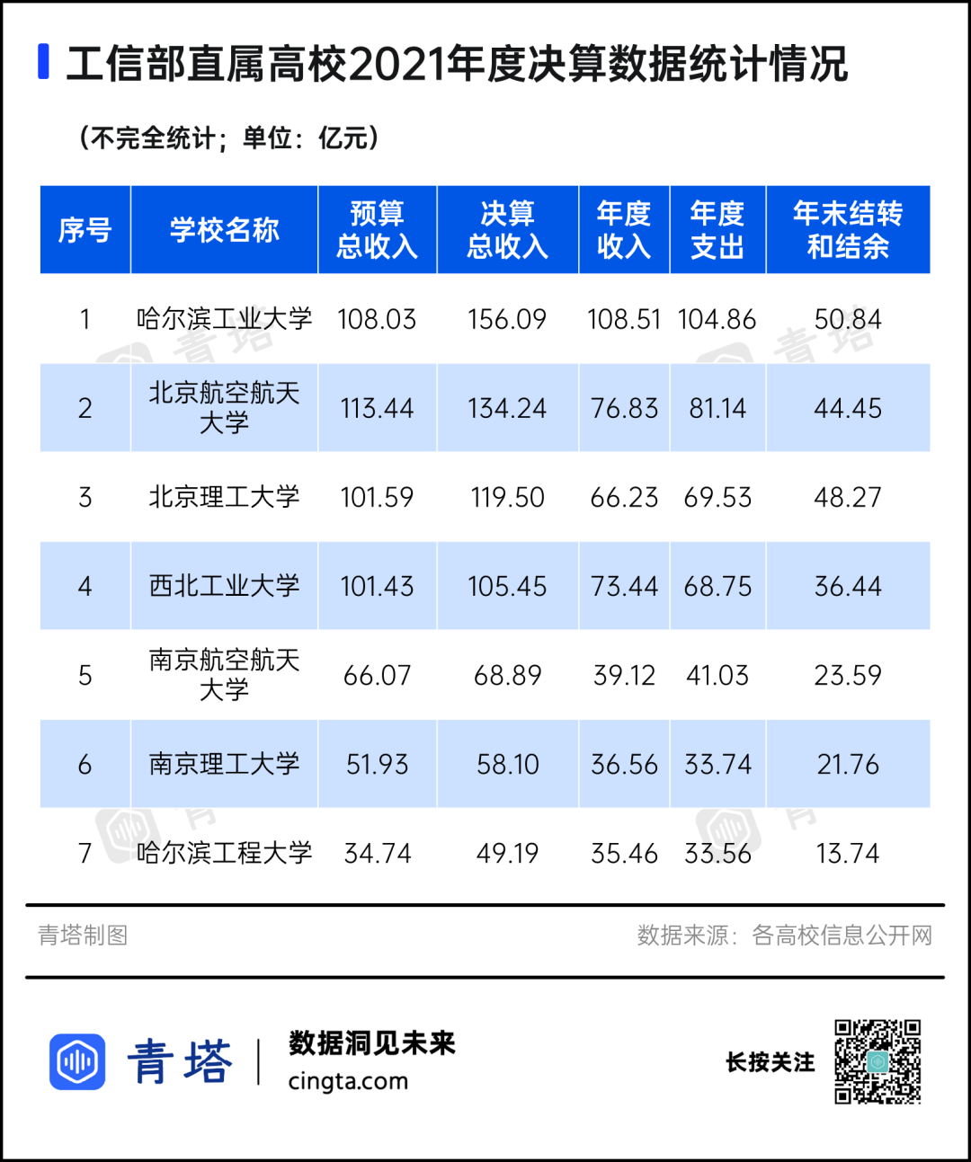 工信部直属高校中,哈尔滨工业大学的决算总收入达到156.09亿元,数量最多。