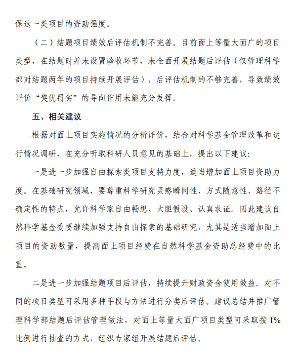 (二)结题项目绩效后评估机制不完善。目前面上等量大面广的项目类型,在结题时并未设置验收环节,未全面开展结题后评估(仅管理科学部对结题两年的项目持续开展评估),后评估机制的不够完善,导致绩效评价“奖优罚劣”的导向作用未能充分发挥。