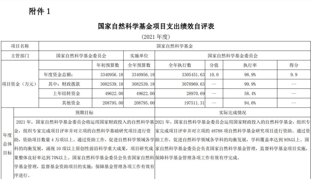 国家自然科学基金项目绩效自评综述:据年初设定的绩效目标,项目 绩效自评得分 97.9 分。项目全年预算数为 3,340,956.18 万元,执行数为 3,305,451.63 万元,完成预算的 98.9%。