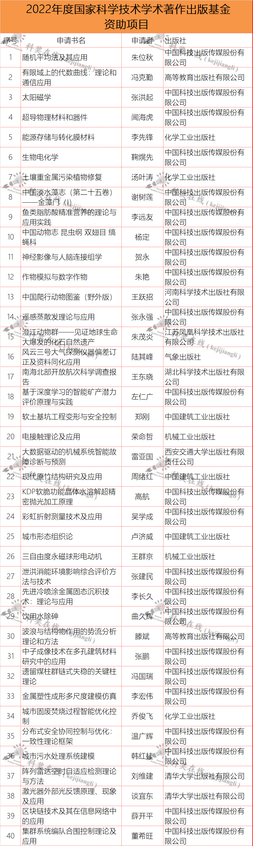 2022年度国家科学技术学术著作出版基金资助项目评审工作已经结束。经专家评审、国家科学技术学术著作出版基金委员会批准,确定了2022年度国家科学技术学术著作出版基金资助项目,现予以公示(见附件)。公示时间为2022年8月24日至28日。