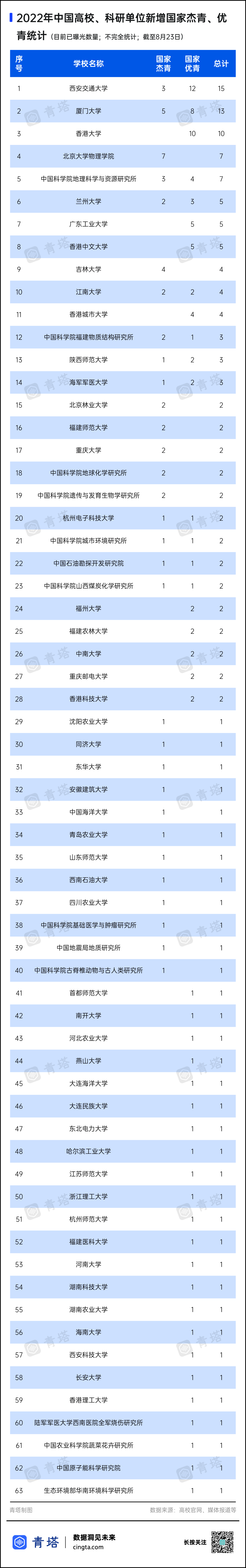 各高校、科研单位已经披露的国家杰青、优青数量汇总如下。目前,各单位杰青优青新增情况还在陆续公布中,青塔将持续关注,敬请期待~