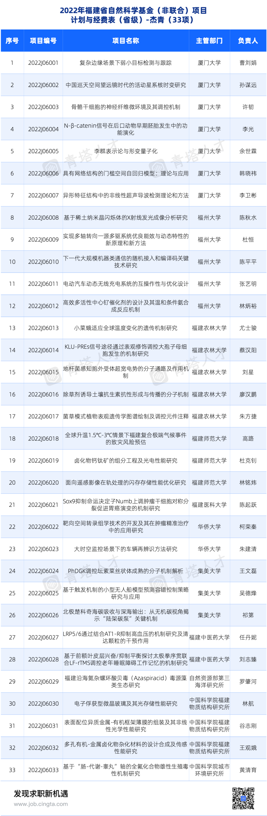 8月2号,福建省科学技术厅发布了省科学基金项目计划和经费表,其中省杰青项目共计33项,每人资助30万元。