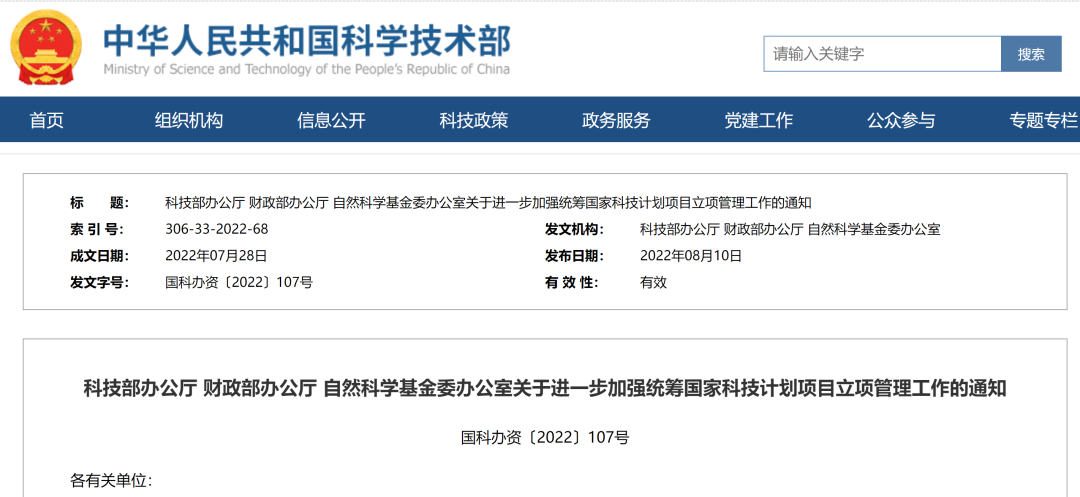 近期,科技部等三部门发布《关于进一步加强统筹国家科技计划项目立项管理工作的通知》,总体要求里提到,进一步强化创新质量和贡献导向,各相关单位不以承担科研项目和经费多少作为评价科研人员的标准。