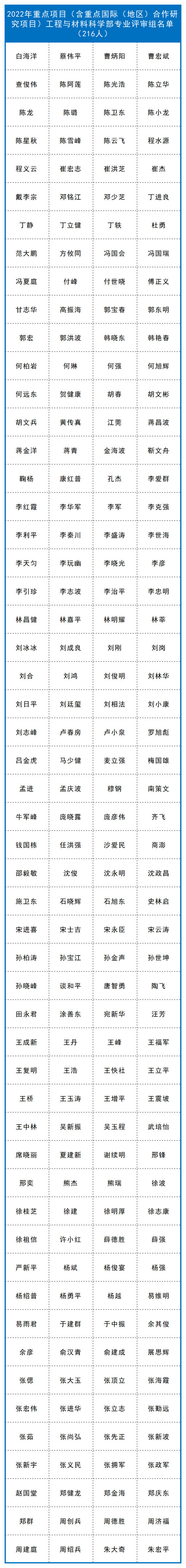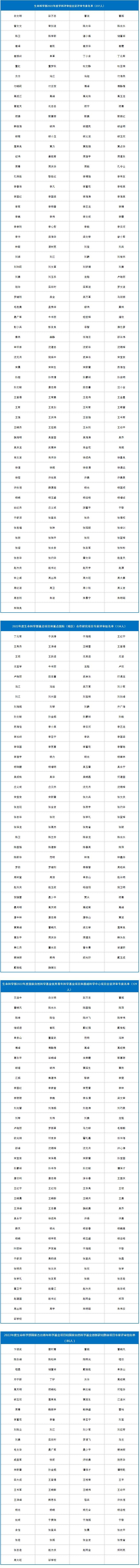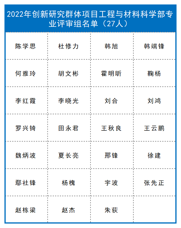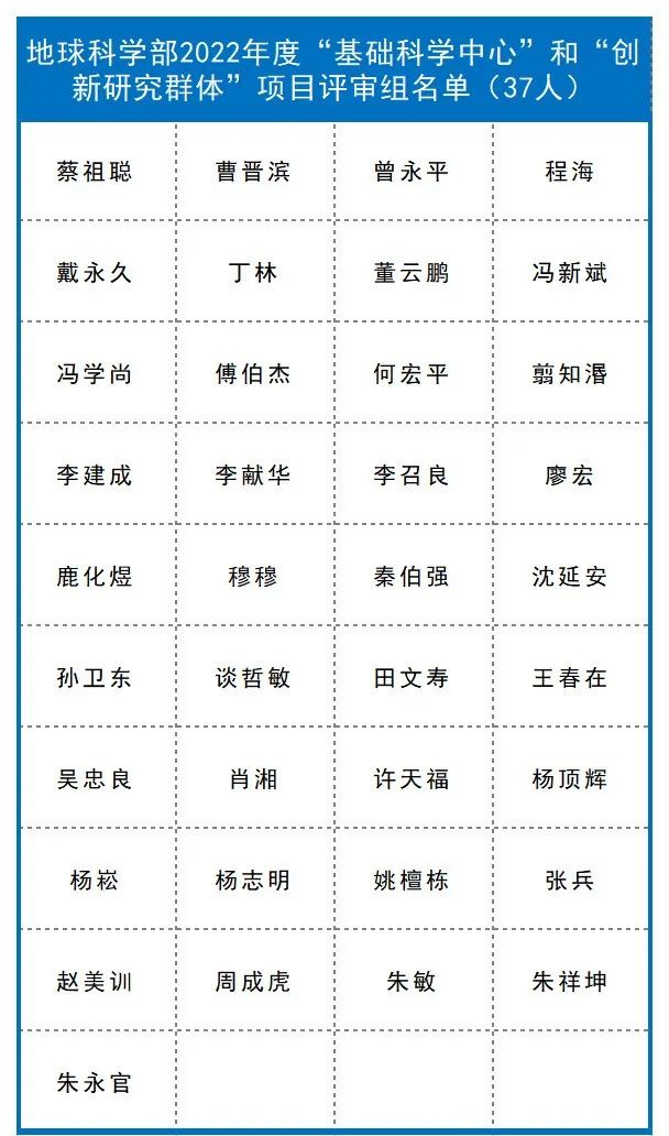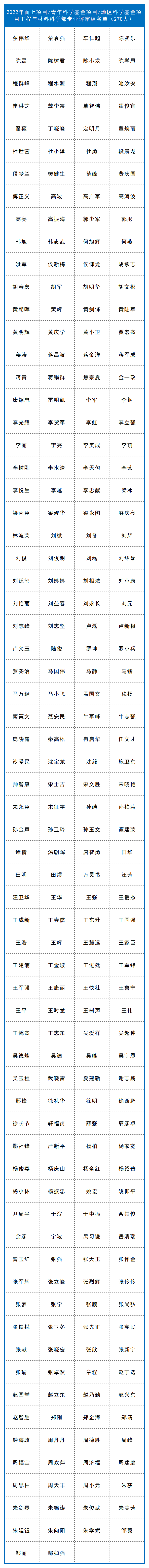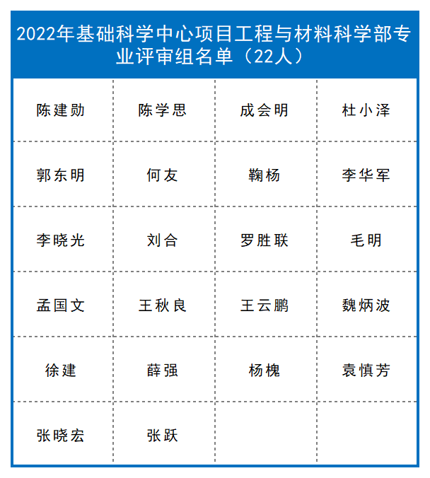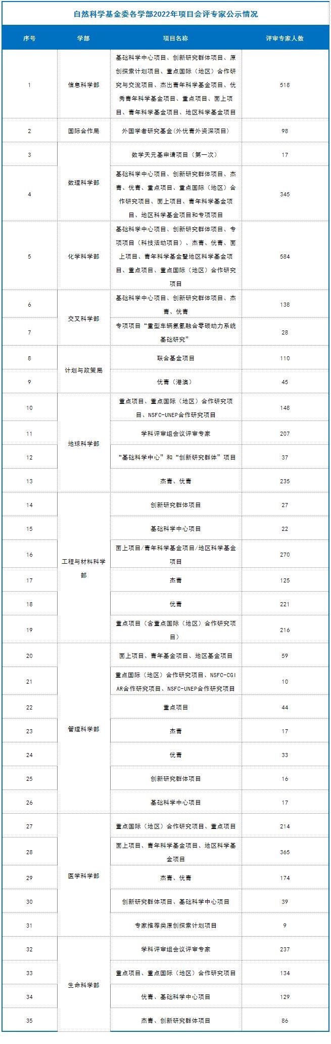 截至目前,已有九个学部、计划与政策局及国际合作局公布了部分项目的评审组专家名单,共4974人。其中:计划与政策局公布了2022年度国家自然科学基金联合基金项目会议评审专家110人,优秀青年科学基金项目(港澳)评审会议专家名单45人。数理科学部公布了2022年度项目评审会议专家名单348人,数学天元基申请项目第一次评审会议专家名单17人。信息科学部公布了2022年度基础科学中心项目、创新研究群体项目、原创探索计划项目、重点国际(地区)合作研究与交流项目、杰出青年科学基金项目、优秀青年科学基金项目、重点项目、面上项目、青年科学基金项目、地区科学基金项目专业评审组名单518人。国际合作局公布了2022年外国学者研究基金(外优青外资深项目)评审会专家名单98人。医学科学部公布2022年度重点国际(地区)合作研究项目、重点项目专业评审组组成名单214人,面上项目、青年科学基金项目、地区科学基金项目会议评审专家组名单365人。杰青、优青项目评审组名单174人,创新研究群体项目、基础科学中心项目评审组名单39人,2022年(上半年)专家推荐类原创探索计划项目专业评审组组成名单9人。地球科学部公布2022年度重点项目、重点国际(地区)合作研究项目、NSFC-UNEP合作研究项目评审组名单148人,学科评审组会议评审专家名单207人,“基础科学中心”和“创新研究群体”项目评审组名单37人,杰青、优青项目评审组名单235人。化学科学部公布了2022年度项目评审会专家组名单584人。工程与材料科学部公布了2022年度创新研究群体项目专业评审组名单27人,基础科学中心项目专业评审组名单22人,面上项目/青年科学基金项目/地区科学基金项目专业评审组名单270人,杰出青年科学基金项目专业评审组名单125人,优青项目评审组名单221人,重点项目(含重点国际(地区)合作研究项目)评审组名单216人。交叉科学部公布了2022年度基础科学中心项目、创新研究群体项目、国家杰出青年科学基金项目、优秀青年科学基金项目评审组专家组成名单138人,专项项目“重型车辆氨氢融合零碳动力系统基础研究”会议评审专家组成员名单28人。管理科学部公布了2022年度面上项目、青年基金项目、地区基金项目评审组专家组成名单59人,重点国际(地区)合作研究项目、NSFC-CGIAR合作研究项目、NSFC-UNEP合作研究项目评审组名单10人,重点项目评审组名单44人,杰青项目评审组名单17人,优青项目评审组名单33人,创新研究群体项目评审组名单16人,基础科学中心项目评审组名单17人。生命科学部公布2022年度学科评审组会议评审专家名单237人,重点项目、重点国际(地区)合作研究项目评审组名单134人,优青、基础科学中心项目评审组名单129人,杰青、创新研究群体项目评审组名单86人。