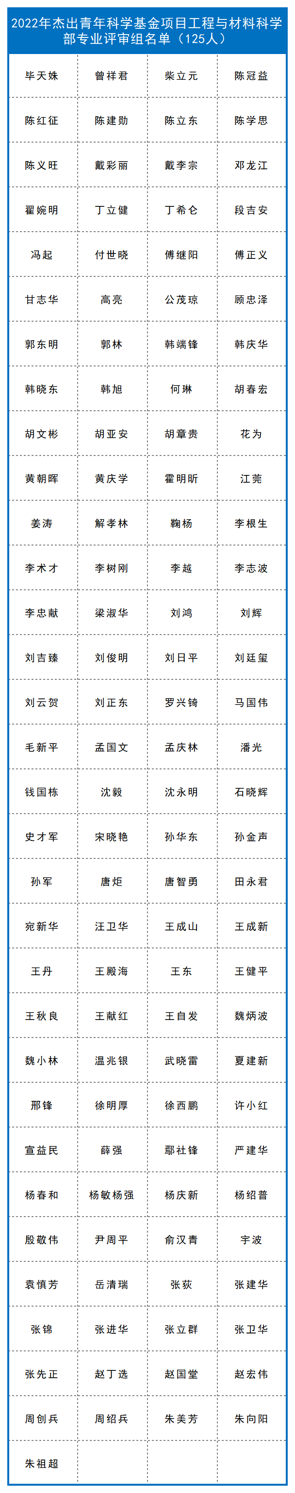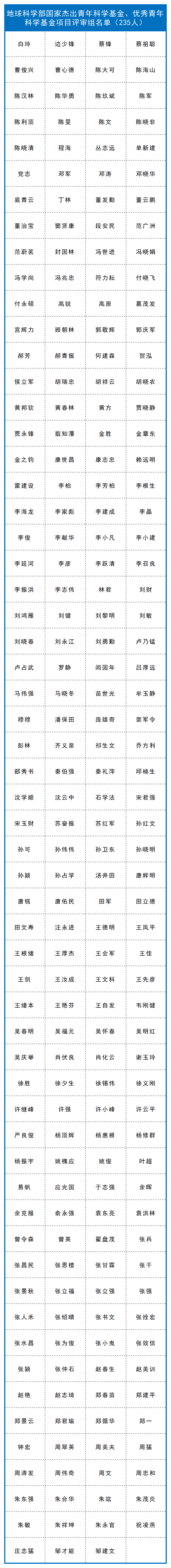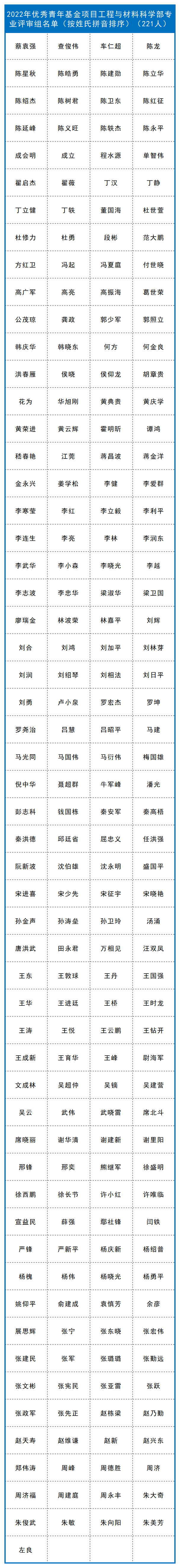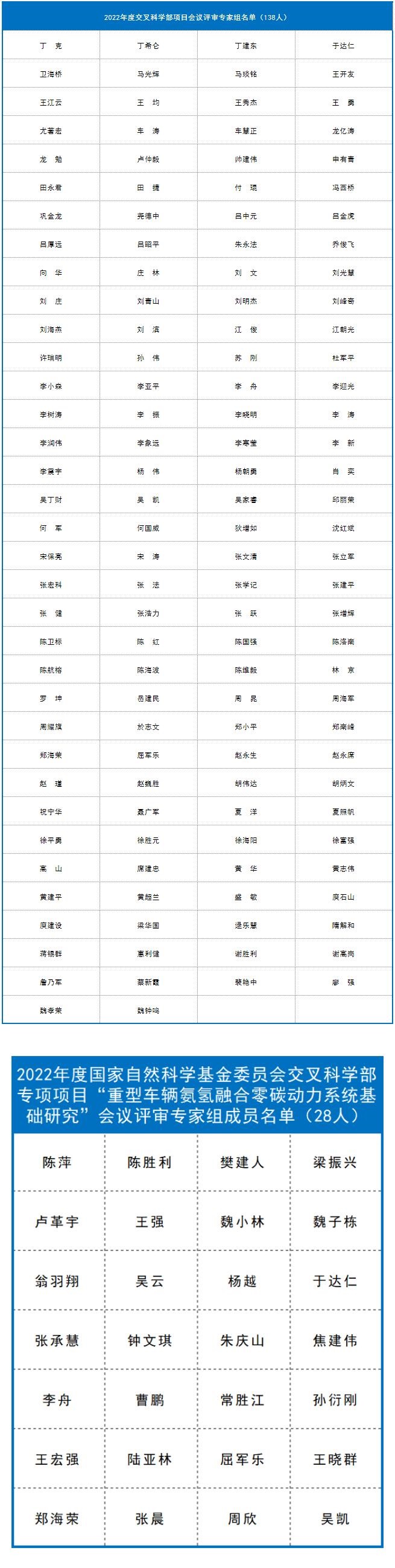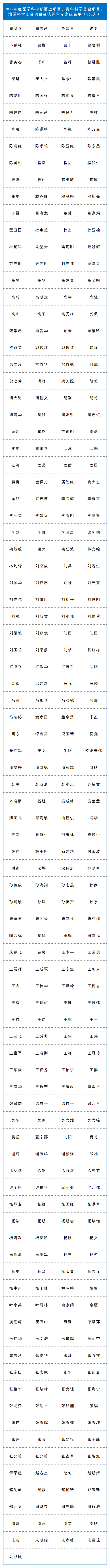 截至目前,已有九个学部、计划与政策局及国际合作局公布了部分项目的评审组专家名单,共4974人。其中:计划与政策局公布了2022年度国家自然科学基金联合基金项目会议评审专家110人,优秀青年科学基金项目(港澳)评审会议专家名单45人。数理科学部公布了2022年度项目评审会议专家名单348人,数学天元基申请项目第一次评审会议专家名单17人。信息科学部公布了2022年度基础科学中心项目、创新研究群体项目、原创探索计划项目、重点国际(地区)合作研究与交流项目、杰出青年科学基金项目、优秀青年科学基金项目、重点项目、面上项目、青年科学基金项目、地区科学基金项目专业评审组名单518人。国际合作局公布了2022年外国学者研究基金(外优青外资深项目)评审会专家名单98人。医学科学部公布2022年度重点国际(地区)合作研究项目、重点项目专业评审组组成名单214人,面上项目、青年科学基金项目、地区科学基金项目会议评审专家组名单365人。杰青、优青项目评审组名单174人,创新研究群体项目、基础科学中心项目评审组名单39人,2022年(上半年)专家推荐类原创探索计划项目专业评审组组成名单9人。地球科学部公布2022年度重点项目、重点国际(地区)合作研究项目、NSFC-UNEP合作研究项目评审组名单148人,学科评审组会议评审专家名单207人,“基础科学中心”和“创新研究群体”项目评审组名单37人,杰青、优青项目评审组名单235人。化学科学部公布了2022年度项目评审会专家组名单584人。工程与材料科学部公布了2022年度创新研究群体项目专业评审组名单27人,基础科学中心项目专业评审组名单22人,面上项目/青年科学基金项目/地区科学基金项目专业评审组名单270人,杰出青年科学基金项目专业评审组名单125人,优青项目评审组名单221人,重点项目(含重点国际(地区)合作研究项目)评审组名单216人。交叉科学部公布了2022年度基础科学中心项目、创新研究群体项目、国家杰出青年科学基金项目、优秀青年科学基金项目评审组专家组成名单138人,专项项目“重型车辆氨氢融合零碳动力系统基础研究”会议评审专家组成员名单28人。管理科学部公布了2022年度面上项目、青年基金项目、地区基金项目评审组专家组成名单59人,重点国际(地区)合作研究项目、NSFC-CGIAR合作研究项目、NSFC-UNEP合作研究项目评审组名单10人,重点项目评审组名单44人,杰青项目评审组名单17人,优青项目评审组名单33人,创新研究群体项目评审组名单16人,基础科学中心项目评审组名单17人。生命科学部公布2022年度学科评审组会议评审专家名单237人,重点项目、重点国际(地区)合作研究项目评审组名单134人,优青、基础科学中心项目评审组名单129人,杰青、创新研究群体项目评审组名单86人。