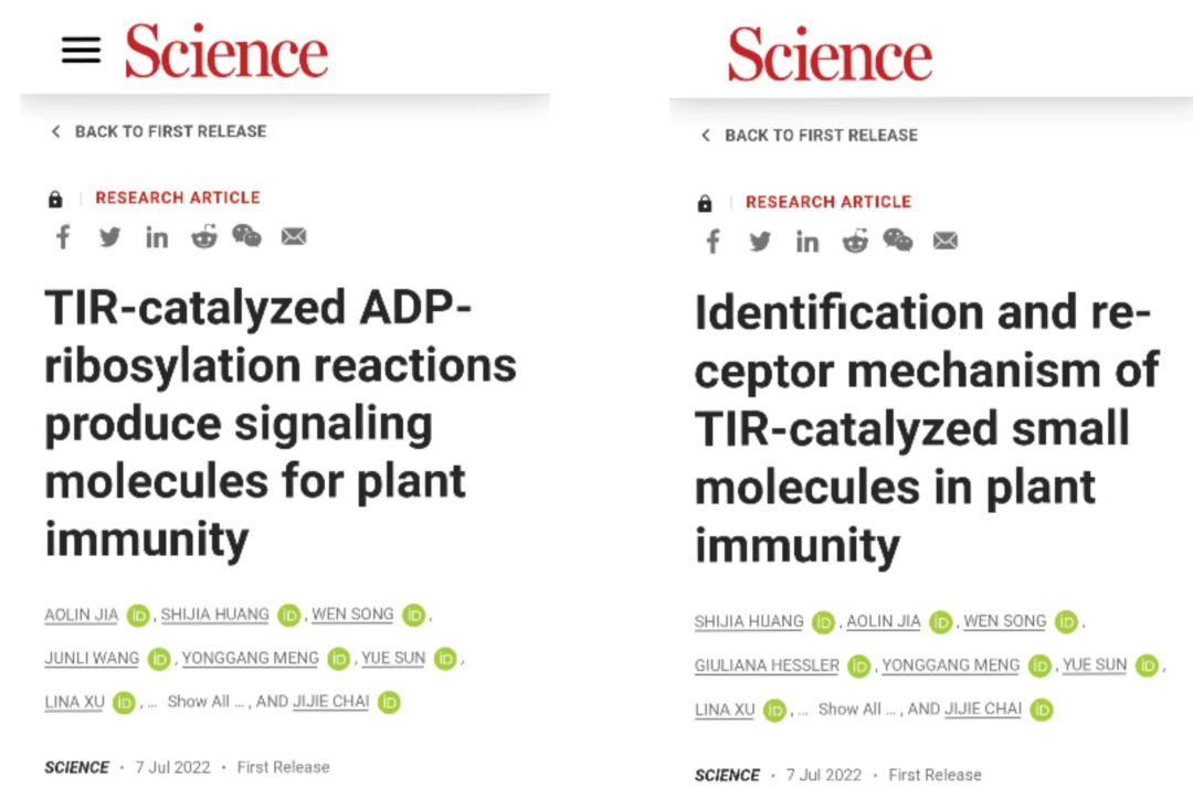 近日,郑州大学常俊标教授课题组通过与清华大学生命科学学院柴继杰教授课题组、马克斯-普朗克植物育种研究所Jane E. Parker教授合作,完成题目为“Identification and receptor mechanism of TIR-catalyzed small molecules in plant immunity”及“TIR-catalyzed ADP-ribosylation reactions produce signaling molecules for plant immunity”两篇论文,并在国际期刊《科学》(Science)杂志上背靠背发表。