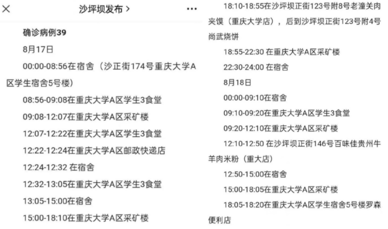 据悉,此次通报的阳性病例中,有多人轨迹涉及重庆大学,并有人为重庆大学学生。例如确诊病例39的轨迹: