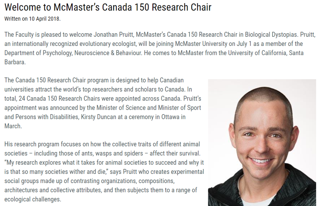 2018年,美国行为生态学家Jonathan Pruitt获选一个著名的加拿大教师职位,仅有的24名“加拿大150研究主席”(Canada 150 Research Chair)之一,McMaster大学当时也进行了宣传。