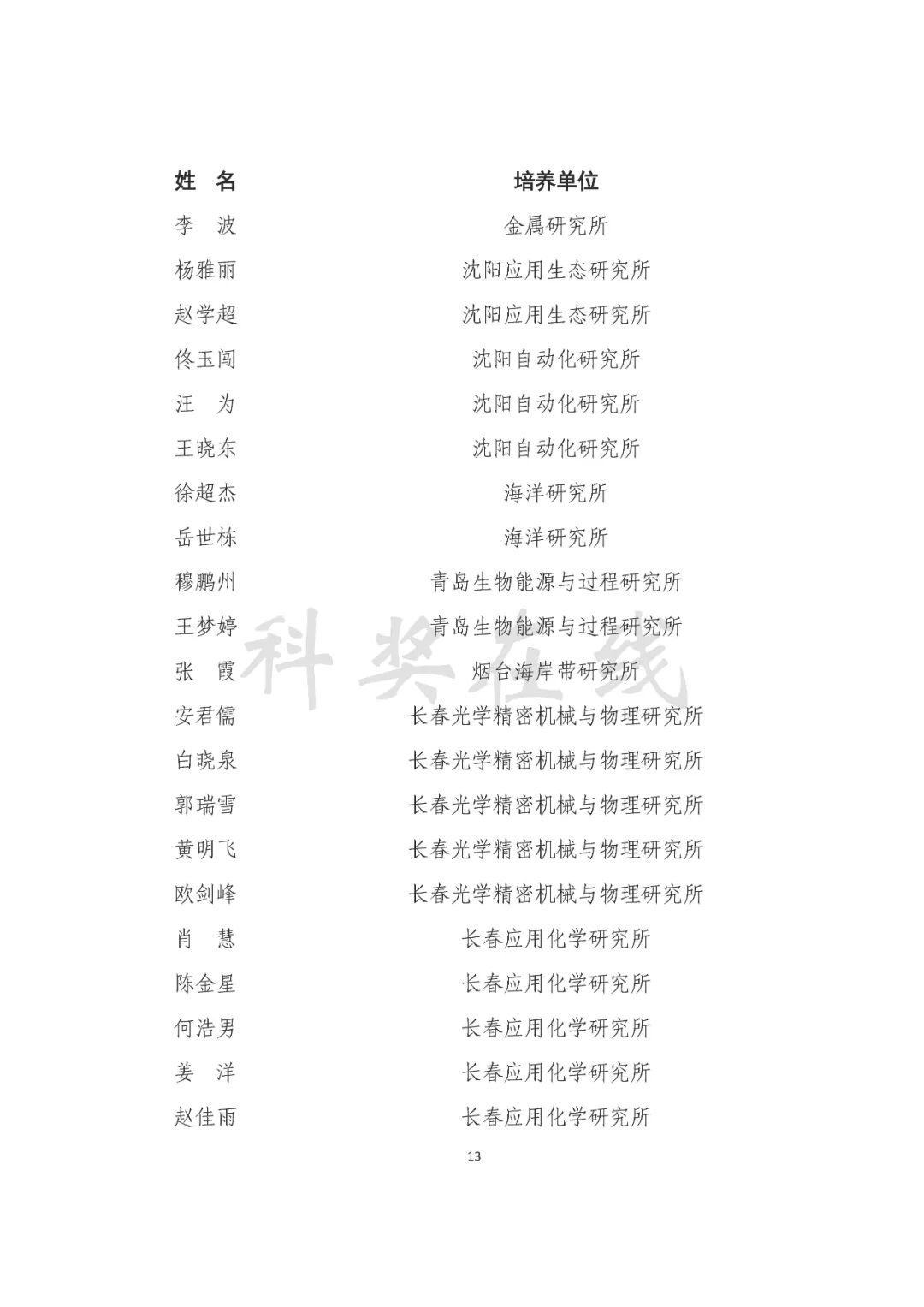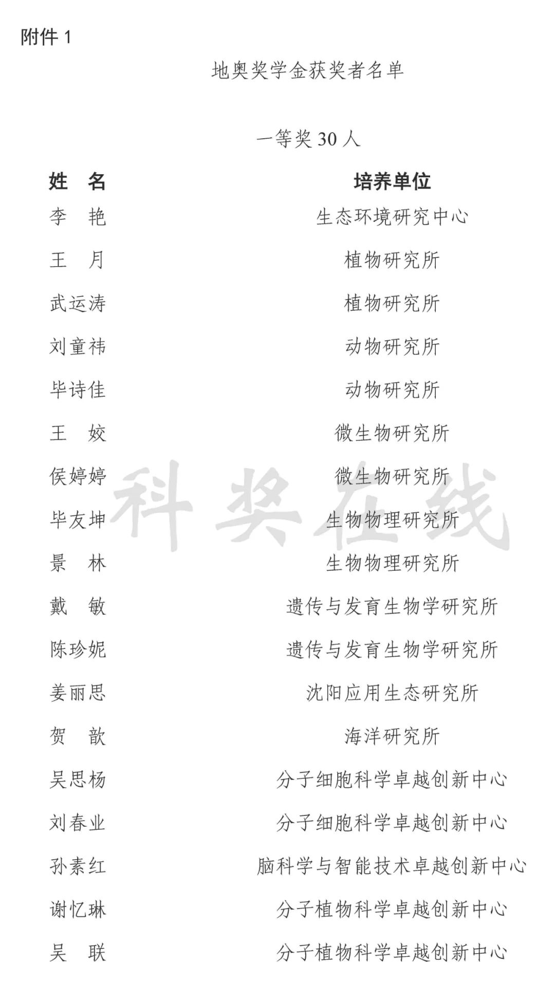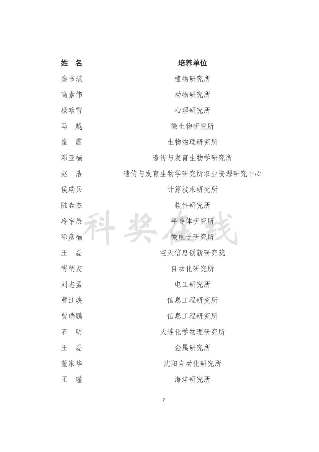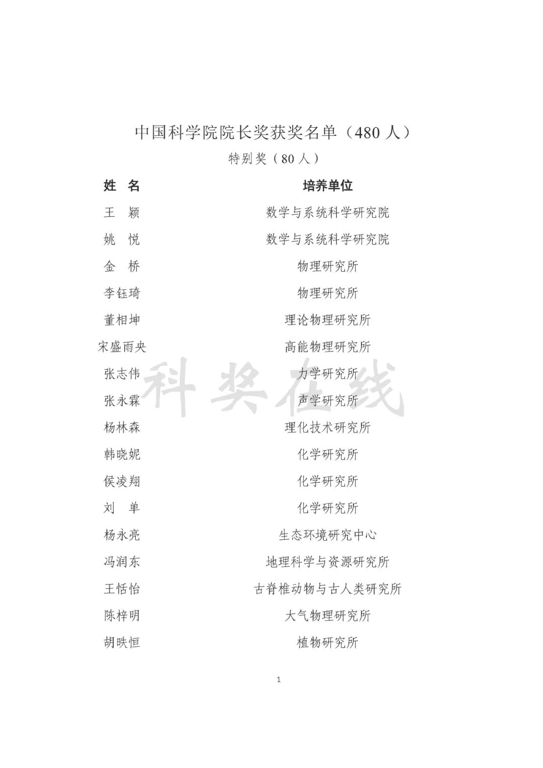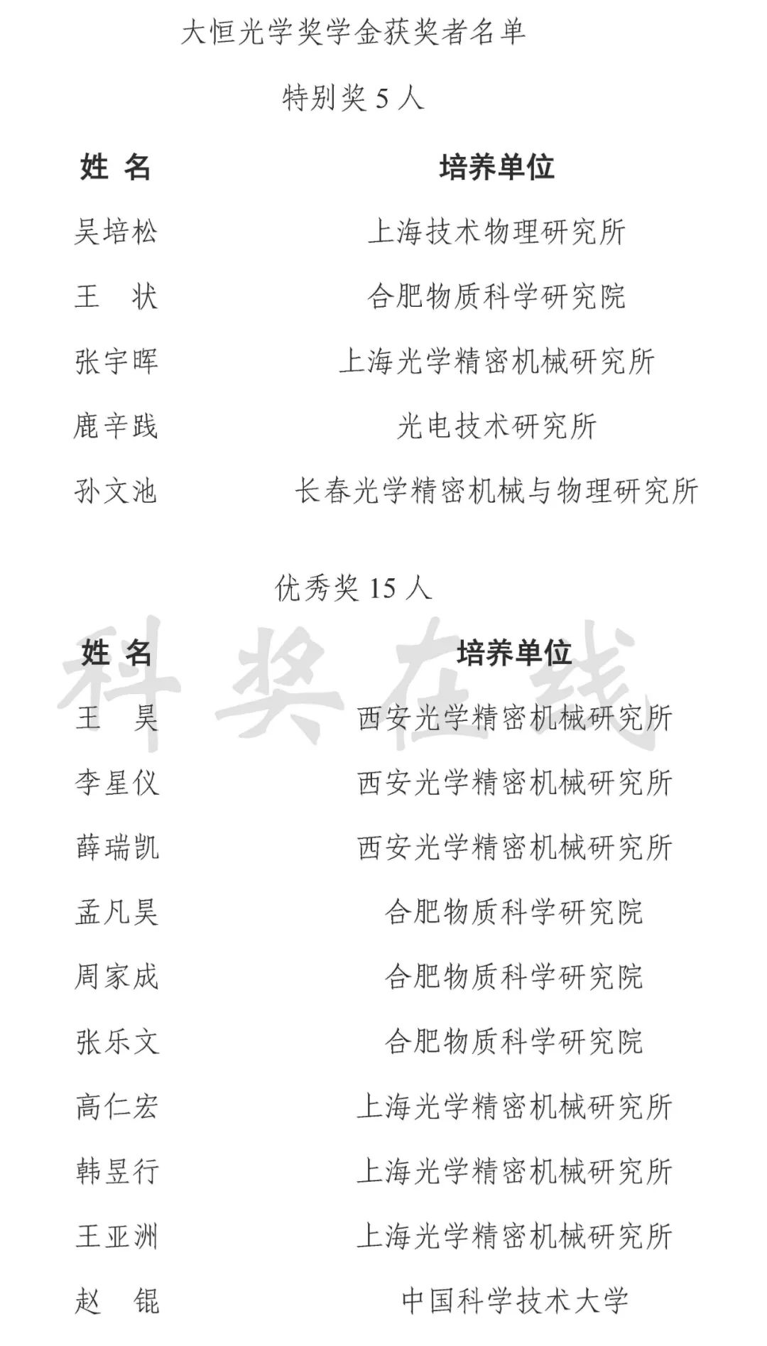 近日,中国科学院公布2022年度“中国科学院院长奖”、中国科学院优秀博士学位论文、“中国科学院优秀导师”、各项冠名奖学金评审结果,经评审,480人荣获2022年度“中国科学院院长奖”,其中王颖等80人获“中国科学院院长特别奖”,刘为等400人获“中国科学院院长优秀奖”。100篇博士论文被评为2022年度中国科学院优秀博士学位论文。173名指导教师获2022年度“中国科学院优秀导师”称号。90人获得地奥奖学金,20人获得大恒光学奖学金。获奖名单如下: