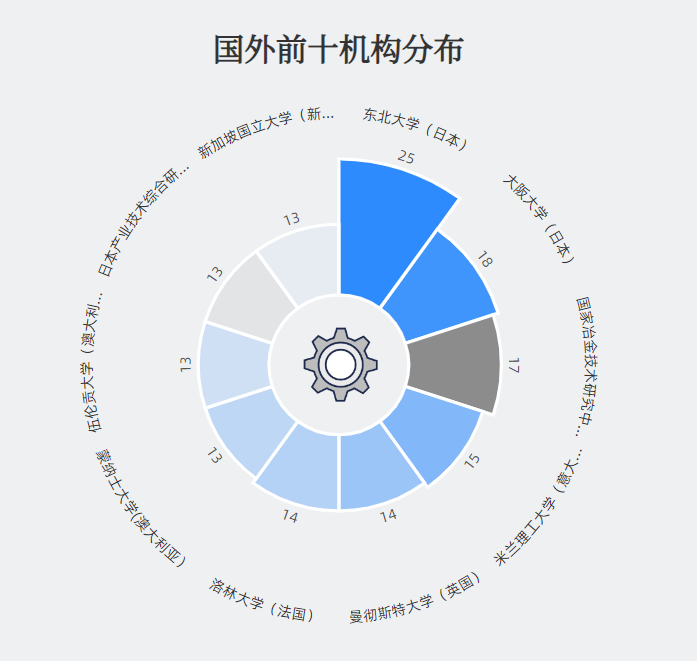 国外材料腐蚀与失效顶尖学者分布前十机构多为高校,其中日本东北大学顶尖人数25人,超过了第二名的日本大阪大学(18人)居首位。国家冶金技术研究中心(西班牙)和米兰理工大学学者人数为15,17人位居三四位。曼彻斯特大学、洛林大学等其他机构顶尖学者数在15人以下,排在后位。国外学者多数来自于排名靠前的知名院校,为材料腐蚀与失效学科提供了大量人才。国外高校在学者来源中占主要部分。