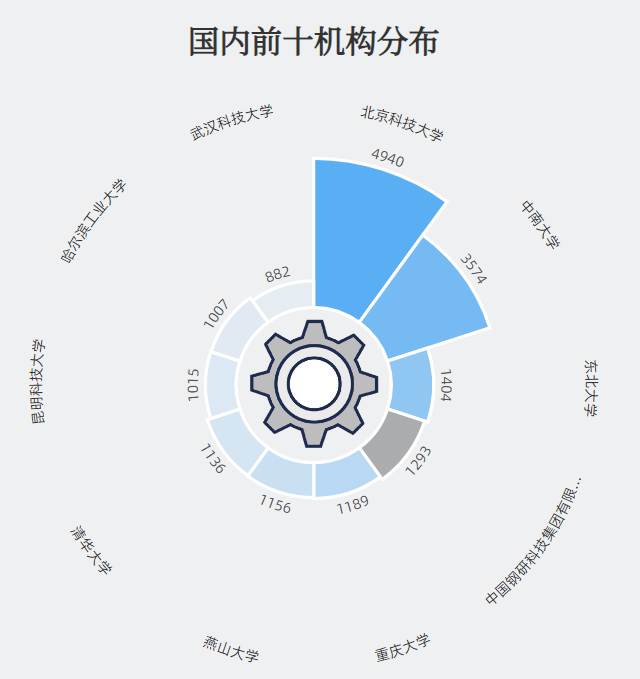 材料腐蚀与失效学者数量前十的国内机构中,北京科技大学有4940位学者位居首位,中南大学拥有3574位学者低于排名第一的北京科技大学(4940名学者)位居第二。东北大学等其余机构学者人数低于1.5千人位居后位。整体来看,前十的国内机构多为高校,仅有中国钢研科技集团有限公司为企业机构,可以推测出国内材料腐蚀与失效学科学者主要集中于高校。
