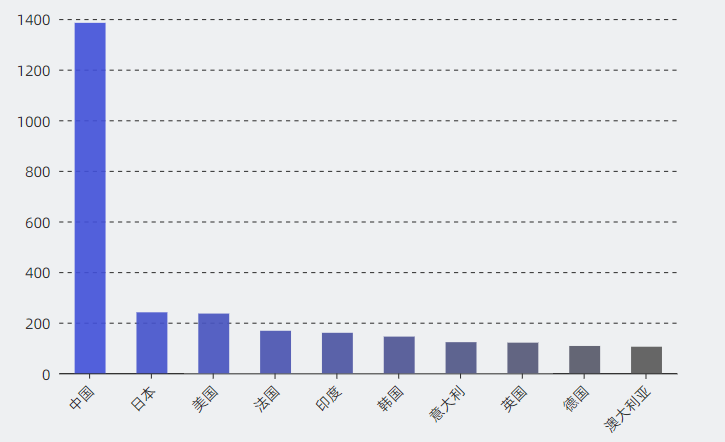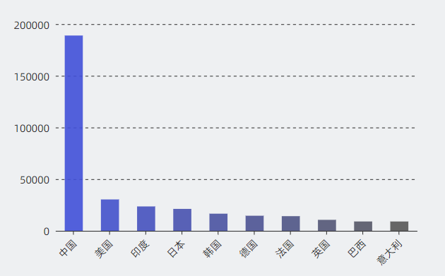 全球材料腐蚀与失效学者在亚洲、北美洲、欧洲以及南美洲分布较多,中国为学者聚集地。具体来看区域分布前十的国家中我国在世界上处于领先的地位,拥有18.8万名学者,是位于排名第二的美国(3万人)的六倍之多。其余七个国家学者皆人数少于3万人位居后位。可以体现出我国在材料腐蚀与失效学者人数方面远高于其他国家学者人数,拥有领先优势。