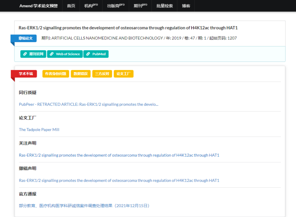 根据其官网的作用及意义注明:Amend是作为科研人员甄别学术论文的潜在风险的参考,在维护学术诚信及预警动态等方面有其重要的现实意义。