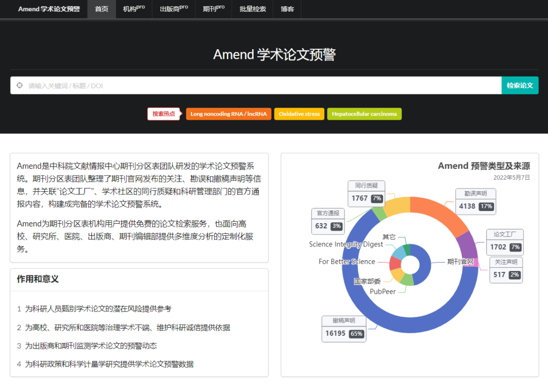 5月17日,中科院文献情报中心继《国际期刊预警名单》后再次发布重要系统——Amend学术论文预警系统;该系统可追溯撤稿论文的发现流程,又能预警潜在撤稿风险。