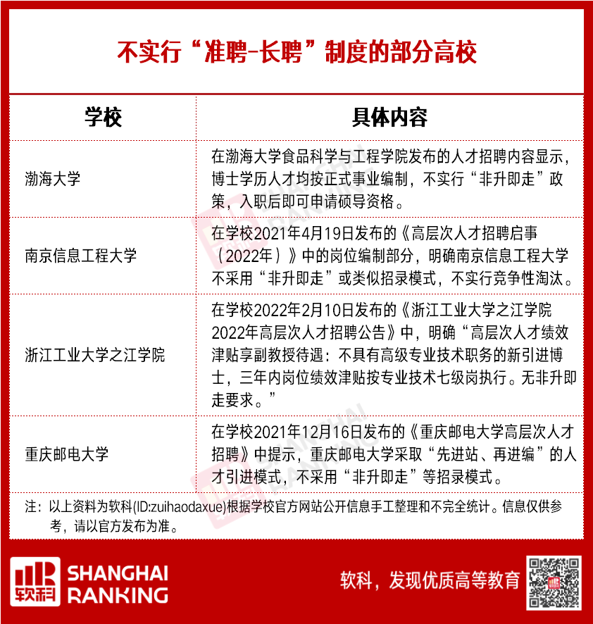 2021年4月,南京信息工程大学发布《高层次人才招聘启事(2022年)》,其中特别标注“提示:南京信息工程大学不采用‘非升即走’或类似招录模式,不实行竞争性淘汰。”事实上,南京信息工程大学不是唯一一所拒绝“非升即走”的高校。2022年2月10日,浙江工业大学之江学院发布《2022年高层次人才招聘公告》,明确“高层次人才绩效津贴享副教授待遇:不具有高级专业技术职务的新引进博士,三年内岗位绩效津贴按专业技术七级岗执行。无非升即走要求”。