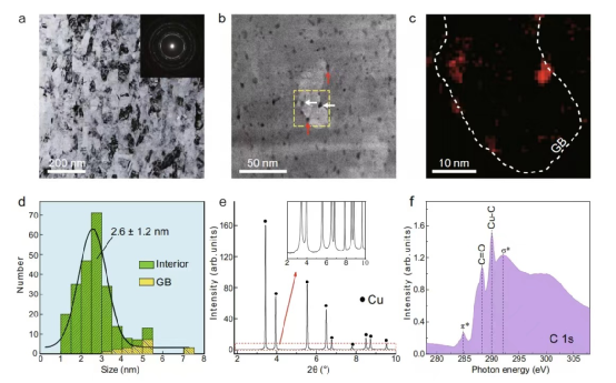 他们通过将碳纳米颗粒引入到纳米晶铜(nc-Cu)和镍(nc-Ni)中来证明纳米分散在纳米晶粒中的策略。纳米碳(粒径为2.6±1.2 nm)在铜纳米颗粒内的高密度(5.6×1023米)(颗粒大小为63±16 nm)。这种颗粒内的纳米分散使纳米碳的两级硬化机制成为可能。从而提高强度和延展性。密集的纳米分散毛皮提供了对晶粒粗化的强大阻力。因此,nc-Cu复合材料(例如,0.8 vol.% C)实现了高抗拉强度(1252±22 MPa),均匀伸长率(13.3±0.9%)和高热稳定性(1小时内稳定在0.72Tm,其中Tm是Cu的熔化温度)同时还具有更好的导电性。该策略因此代表了一种有效的手段,打破了几个相互排斥的特性之间的权衡。他们还使用同样的方法来生产具有出色性能的纳米镍复合材料,强调了纳米分散技术的普遍适用性。