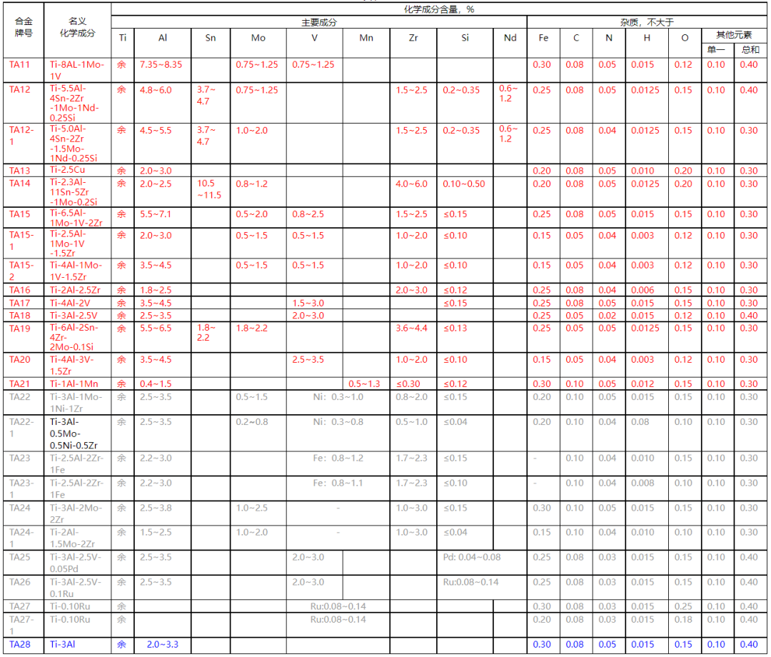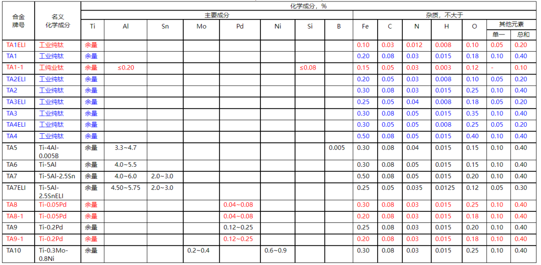 钛及钛合金牌号和化学成分表