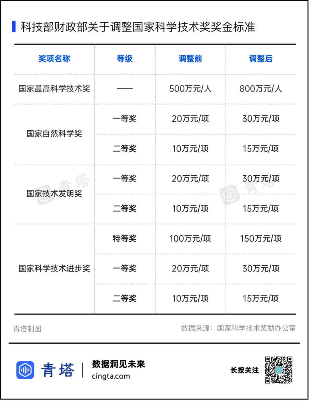 2019年,由1999年设立国家最高科学技术奖时沿袭的500万元奖金调整为800万元/人,且在奖金分配上,从“50万元属获奖人个人所得、450万元用作科研经费”调整为“全部奖金属获奖人个人所得”。