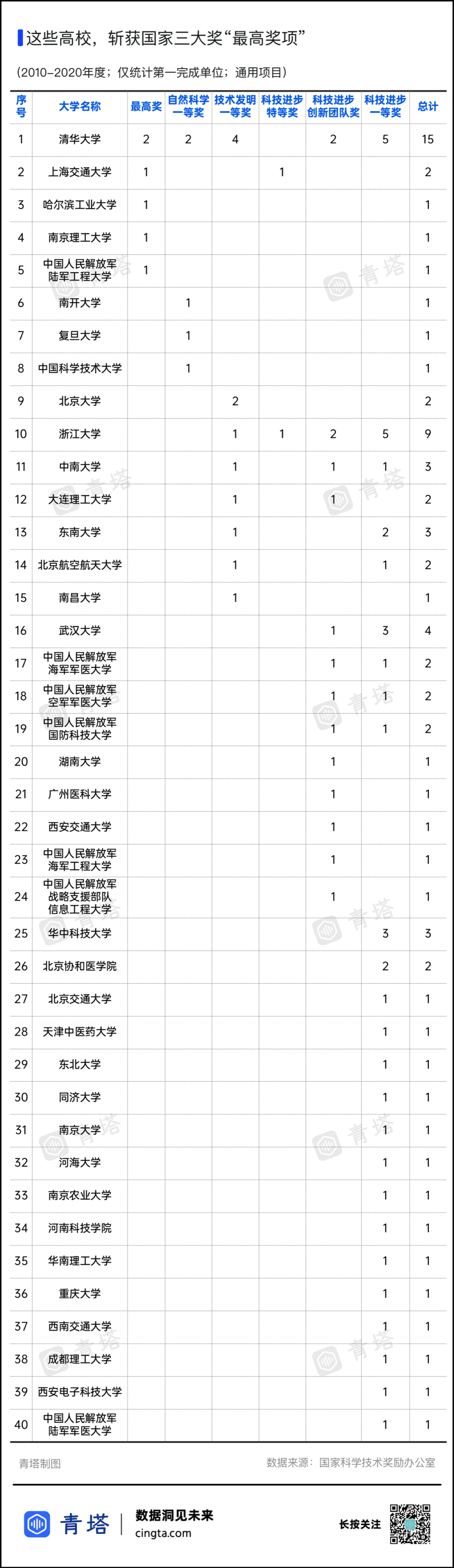 据青塔统计,2010-2020年度国家科学技术奖(通用项目)中,仅40所高校斩获国家科学技术最高奖或”国家三大奖“中的一等奖、特等奖,共计79项。