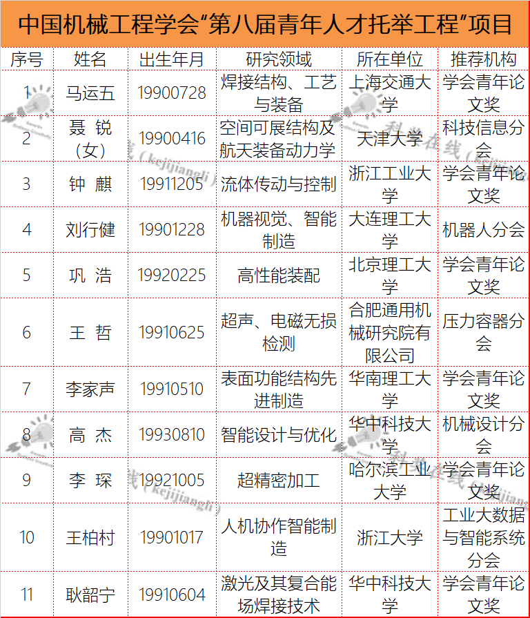 2、中国机械工程学会“第八届青年人才托举工程” 项目 被托举人名单(11人)