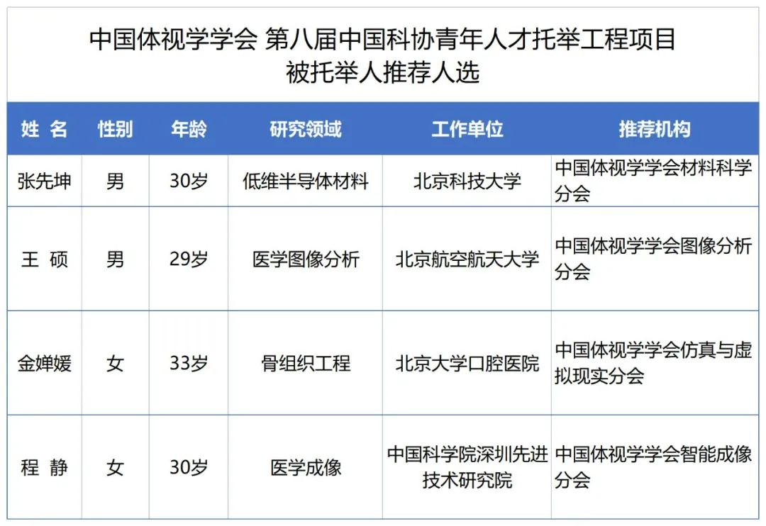2022年10月14日,中国科协发布了第八届中国科协青年人才托举工程项目被托举人遴选工作通知,确定了中国物理学会等73个全国学会(学会联合体)为第八届(2022-2024年度)中国科协青年人才托举工程项目立项单位,中国科协资助300人、自筹资金资助404人。具体推荐名单如下: