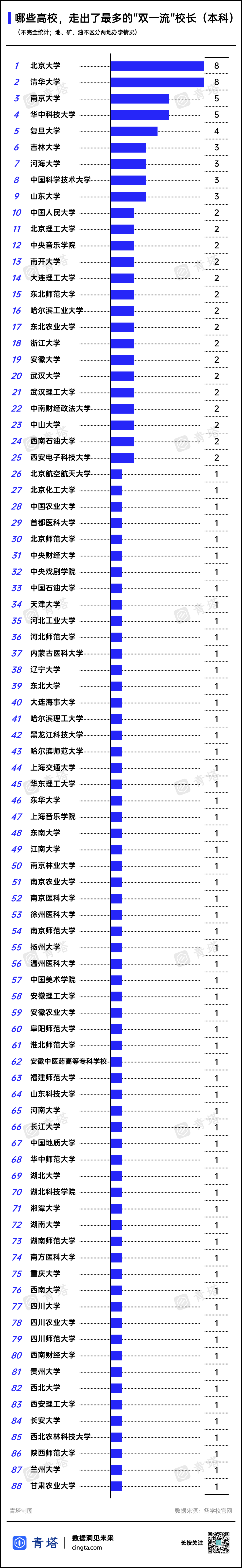 本科毕业院校统计结果显示,北京大学、清华大学均走出了8位“双一流”高校校长,数量最多;南京大学与华中科技大学各自培养了5位“双一流”校长,复旦大学则拥有4位校友担任“双一流”校长。