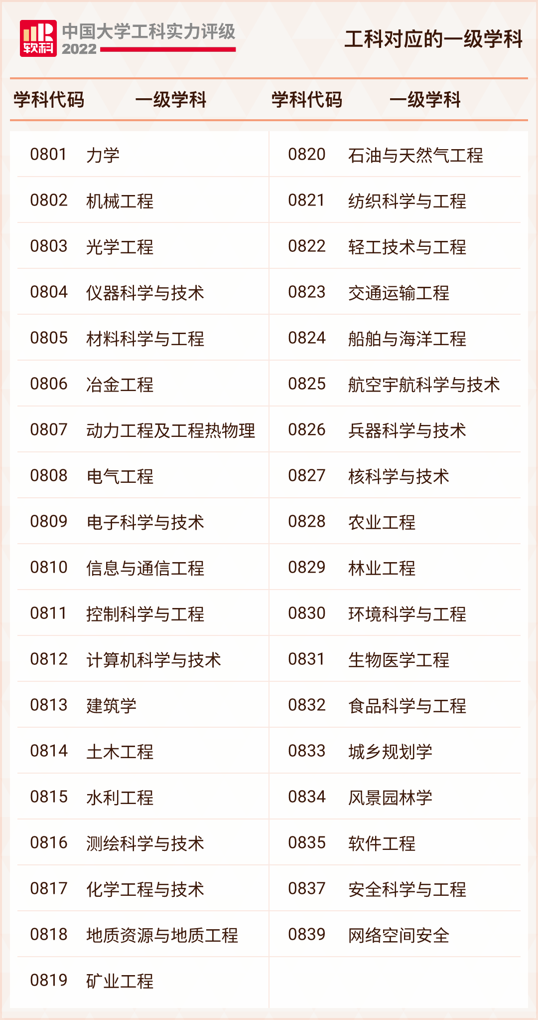 中国大学工科实力评级的对象为所有被纳入2022软科中国大学排名的高校。工科的范围包括工学门类的37个学科,具体如下: