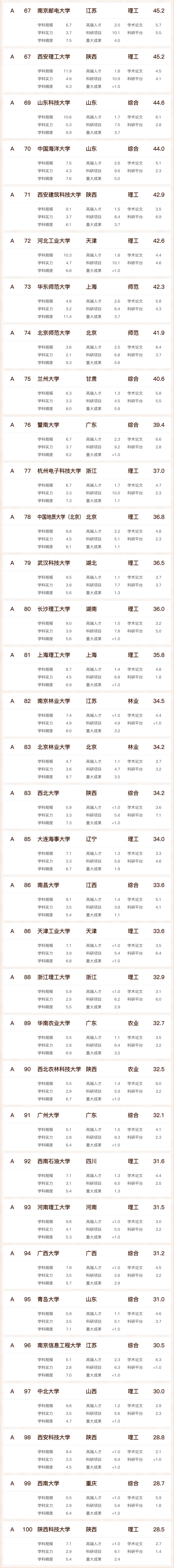 其中,软科中国工科实力A+大学:工科实力全国前20名(相当于工科领域有得分高校的前2%);软科中国工科实力A大学:工科实力全国21~100名(相当于工科领域有得分高校的2%~10%)。