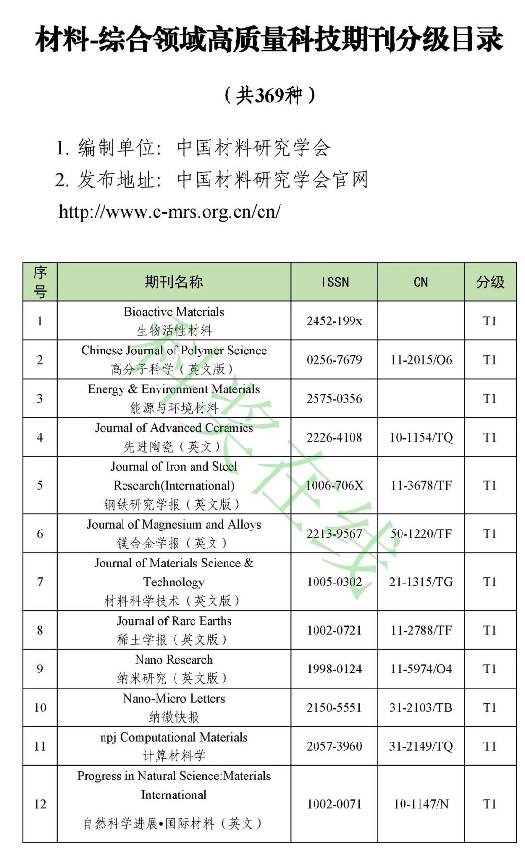 1. 材料-综合领域高质量科技期刊分级目录(共369种)