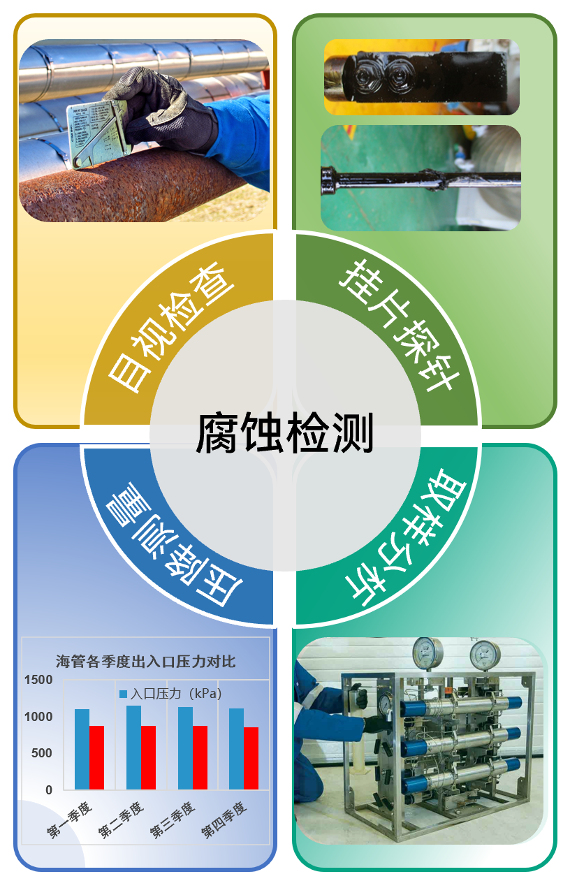 利用漏磁装置、涡流等电子装置对海管壁厚状态进行检测,同时利用超声波装置或射线探伤定期监测平台管线,也可以综合判断腐蚀控制方法的有效性。