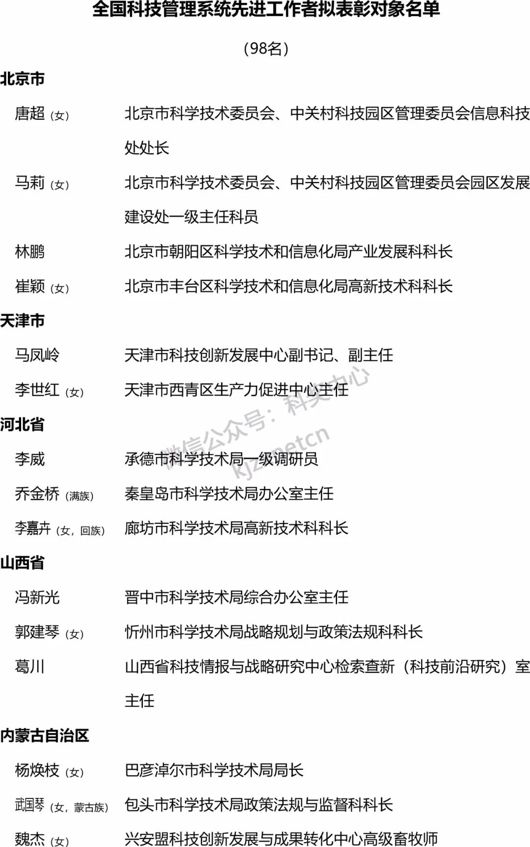 根据《人力资源社会保障部 科技部关于评选全国科技管理系统先进集体和先进工作者的通知》(人社部函〔2022〕66号)要求,经逐级推荐、严格审核,拟表彰全国科技管理系统先进集体125个、先进工作者98名。为切实体现公开、公平、公正原则,充分发扬民主,广泛听取意见,主动接受监督,现将全国科技管理系统先进集体、先进工作者拟表彰对象予以公示。公示期为5个工作日(2022年11月17日至2022年11月23日)。