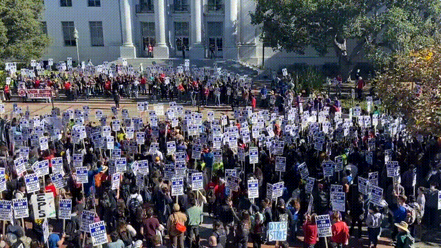 因为加州大学与教工代表和工会谈判失败,大罢工爆发了。
