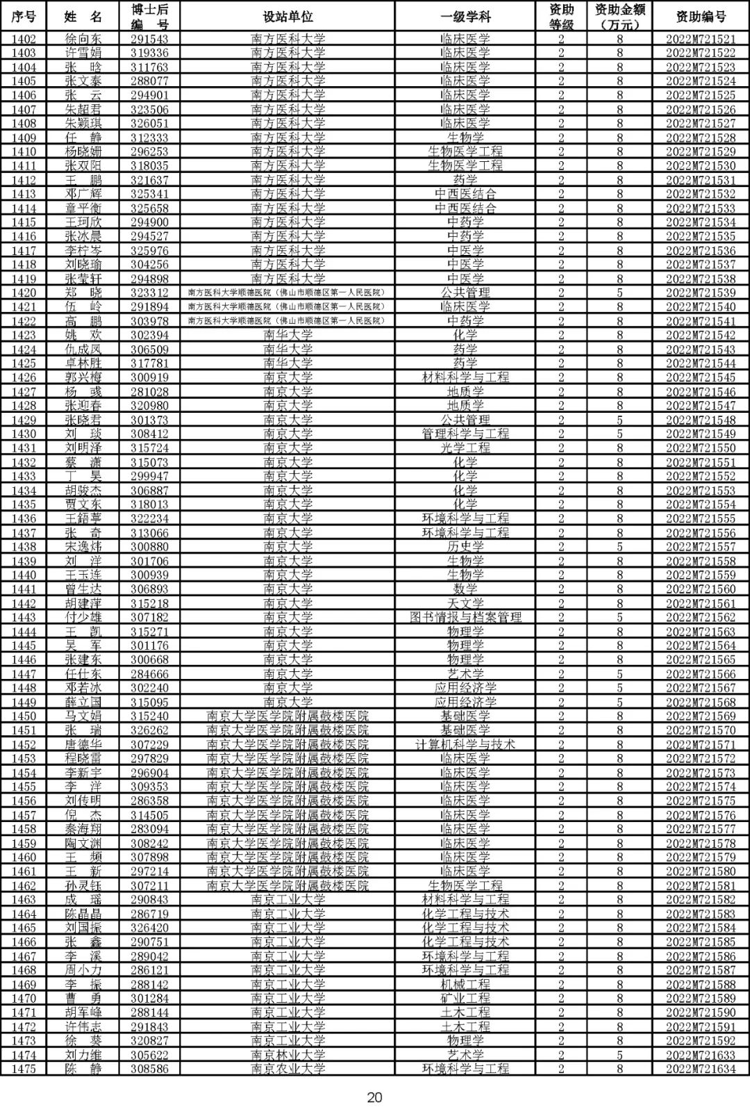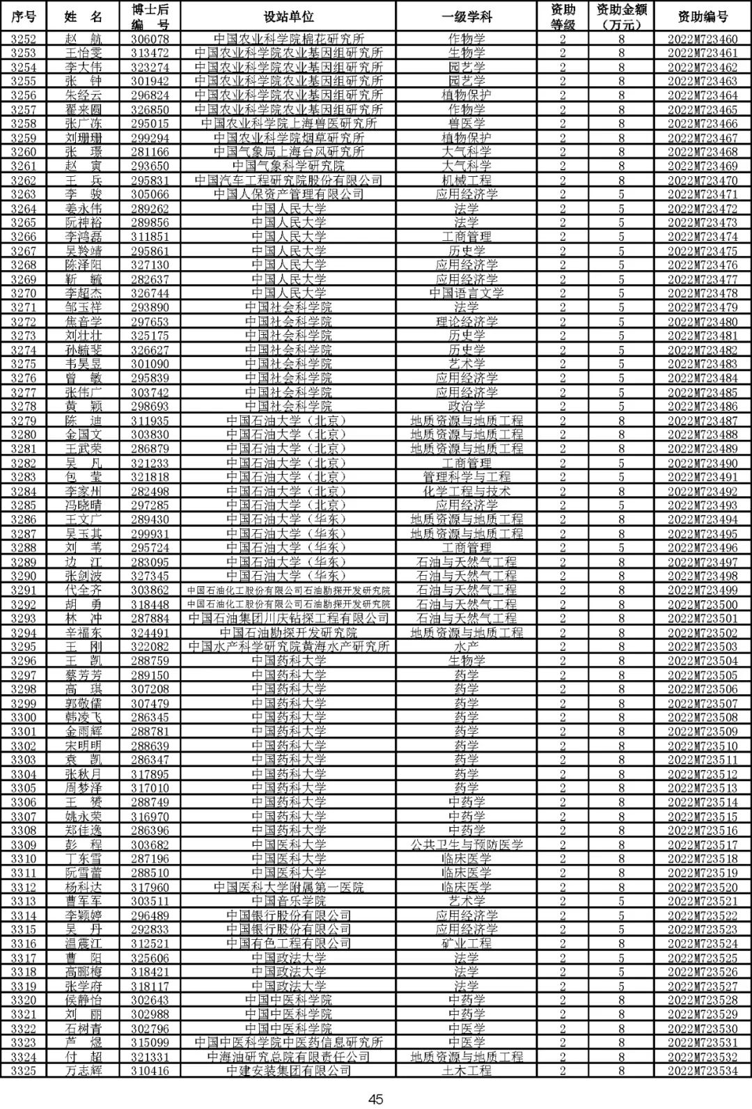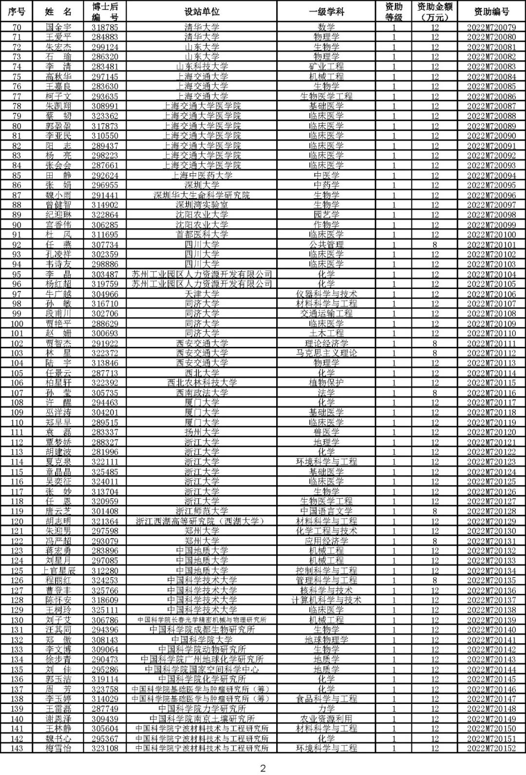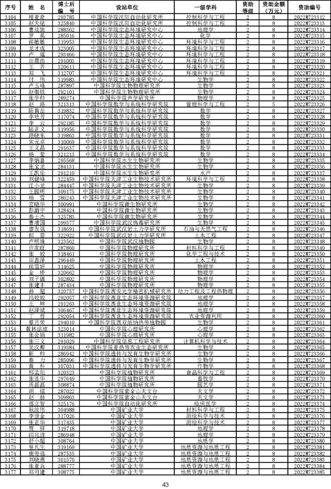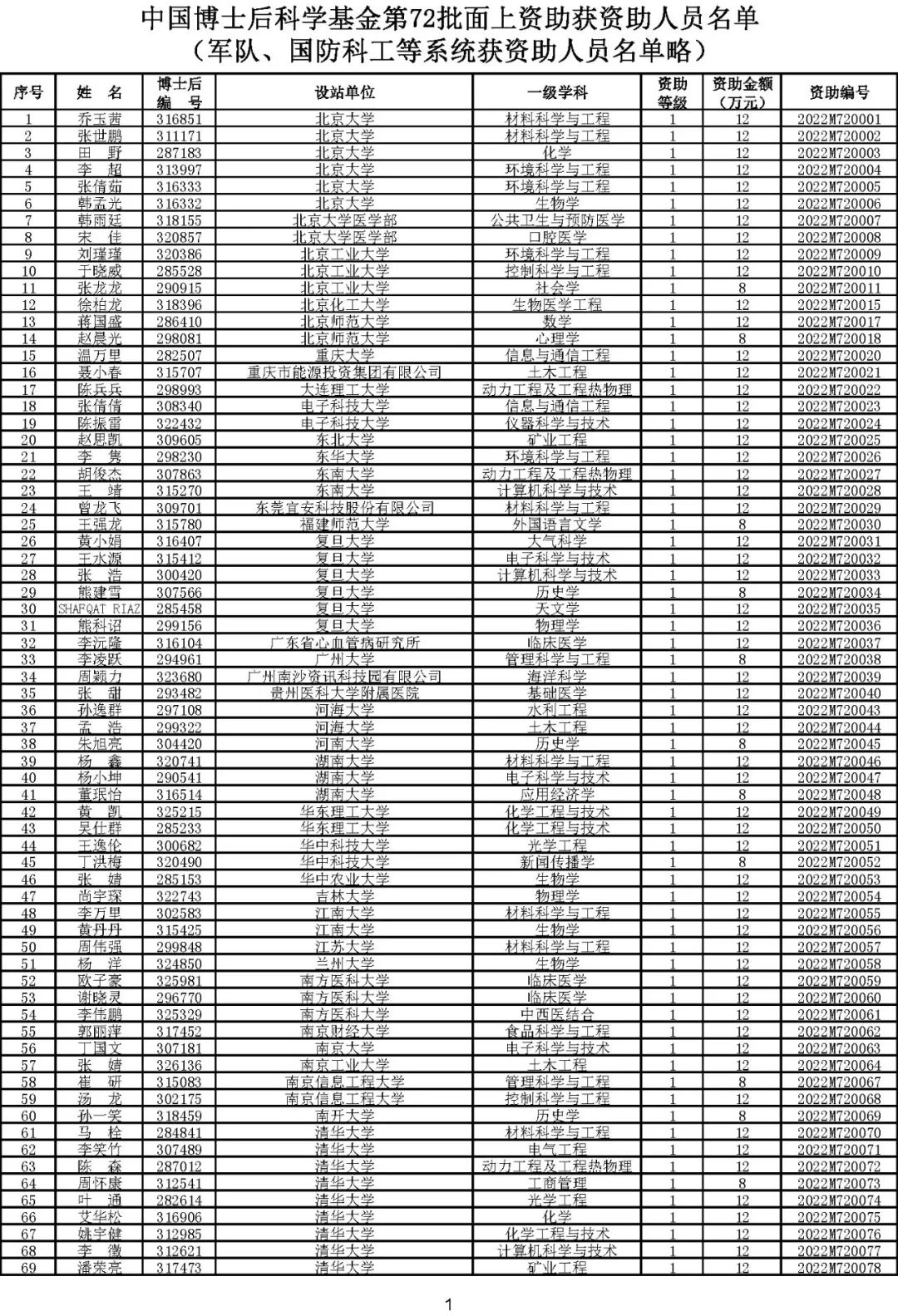 根据《中国博士后科学基金资助规定》(中博基字〔2020〕7号),经专家评审和评审结果公示,决定对3650名博士后研究人员予以中国博士后科学基金第72批面上资助(军队、国防科工等系统获资助人员不含,另行通知)。获资助人员名单详见附件。