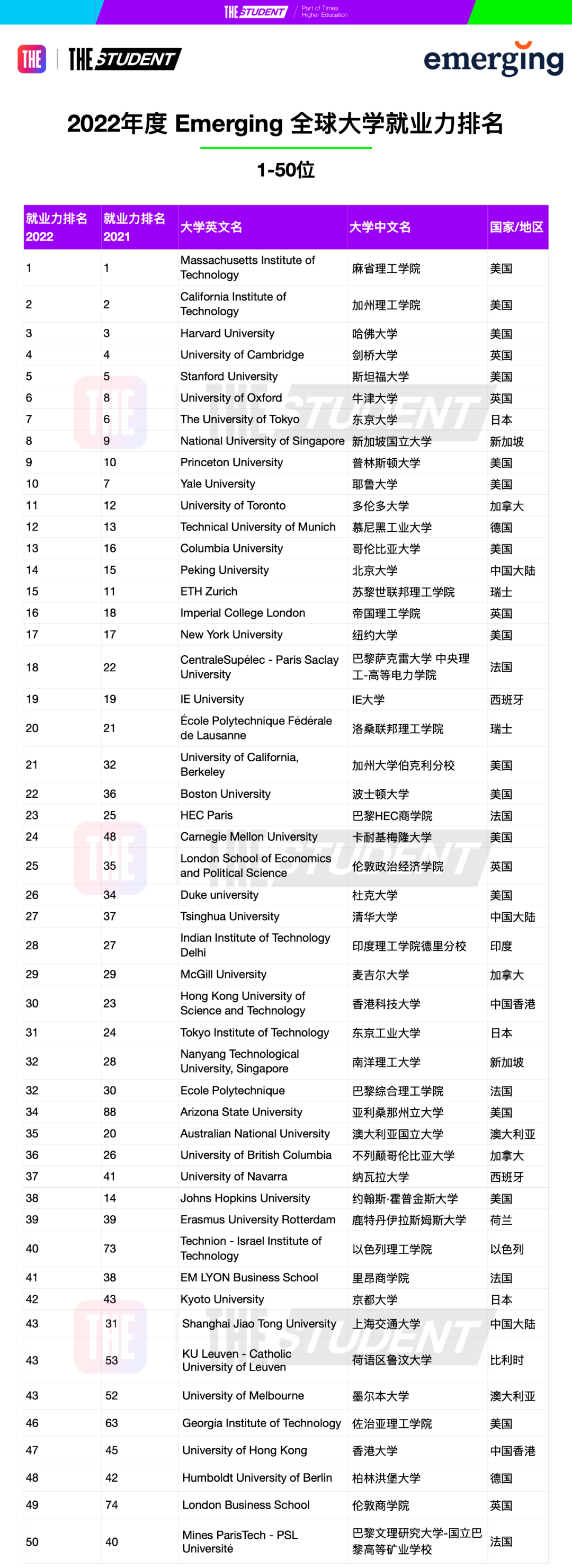 ▲2022年度全球大学就业力排名前10名,图源泰晤士高等教育
