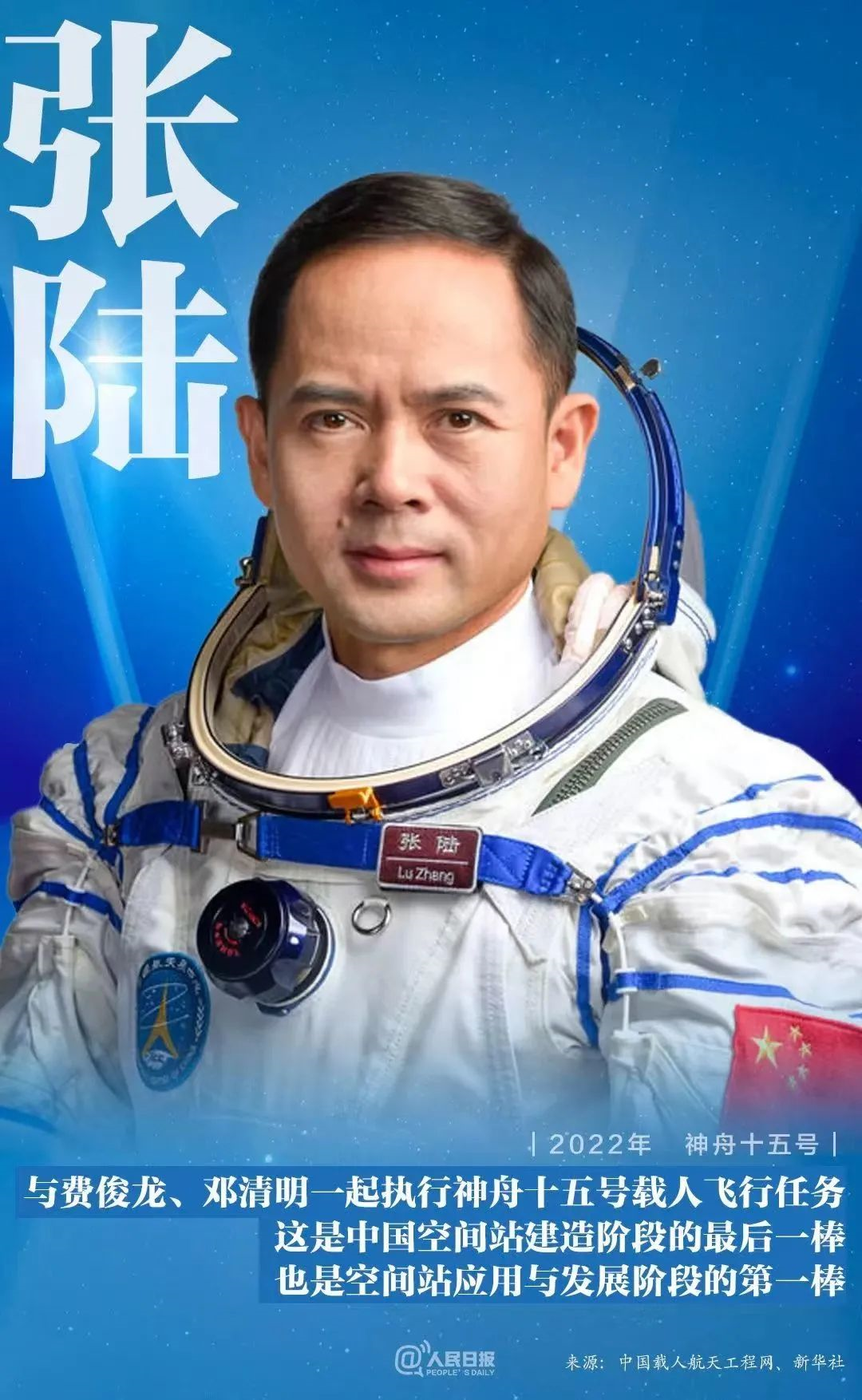 张陆,与费俊龙、邓清明一起执行神舟十五号载人飞行任务。现为中国人民解放军航天员大队二级航天员,大校军衔。曾任空军某训练基地某团司令部空战射击主任,被评为空军一级飞行员。2010年5月入选为我国第二批航天员。