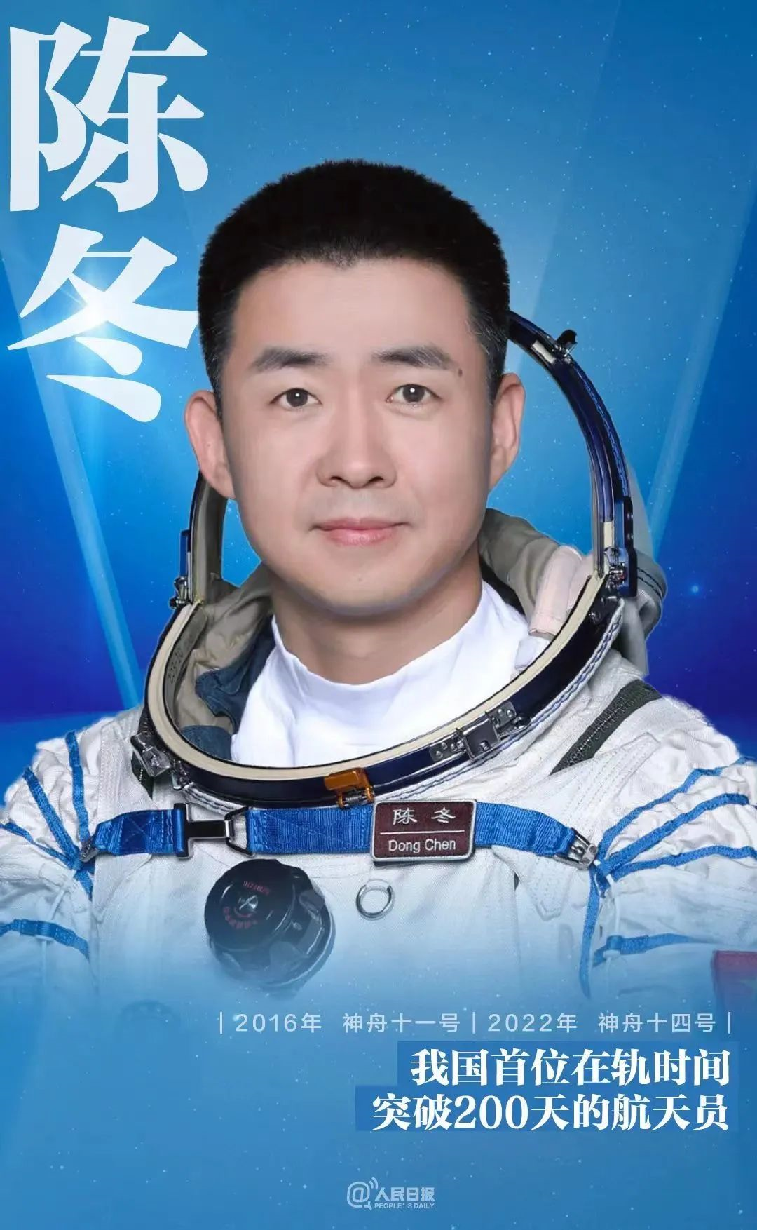 陈冬,汉族,籍贯河南郑州,河南洛阳出生,中共党员。现为中国人民解放军航天员大队一级航天员,大校军衔。曾任空军某师某团某飞行大队大队长,被评为空军一级飞行员。2010年5月入选为我国第二批航天员。2016年10月,执行神舟十一号载人飞行任务。2016年12月,被中共中央、国务院、中央军委授予“英雄航天员”荣誉称号,并获“三级航天功勋奖章”。