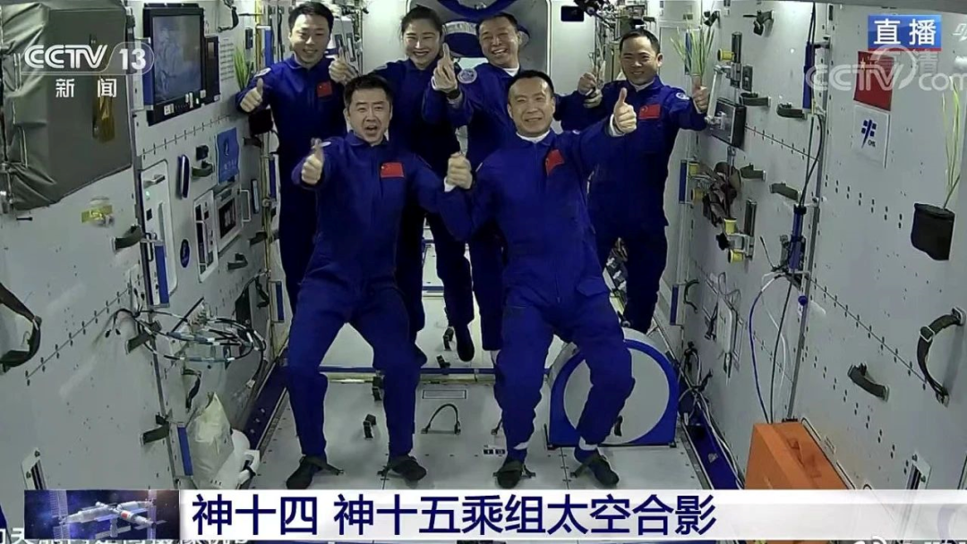 11月30日7时33分,翘盼已久的神舟十四号航天员乘组顺利打开“家门”,热情欢迎远道而来的亲人——神舟十五号航天员乘组入驻“天宫”,这是中国航天员首次在空间站迎接载人飞船来访。“胜利会师”的两个航天员乘组,一起在中国人自己的“太空家园”里留下了一张足以载入史册的太空合影。身处太空的6位中国航天员,承载了所有中华儿女对浩瀚星空的向往,注解了中华民族可上九天揽月的豪情,也再次描下中国航天的进步足迹。