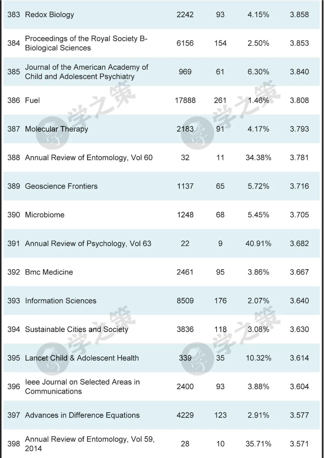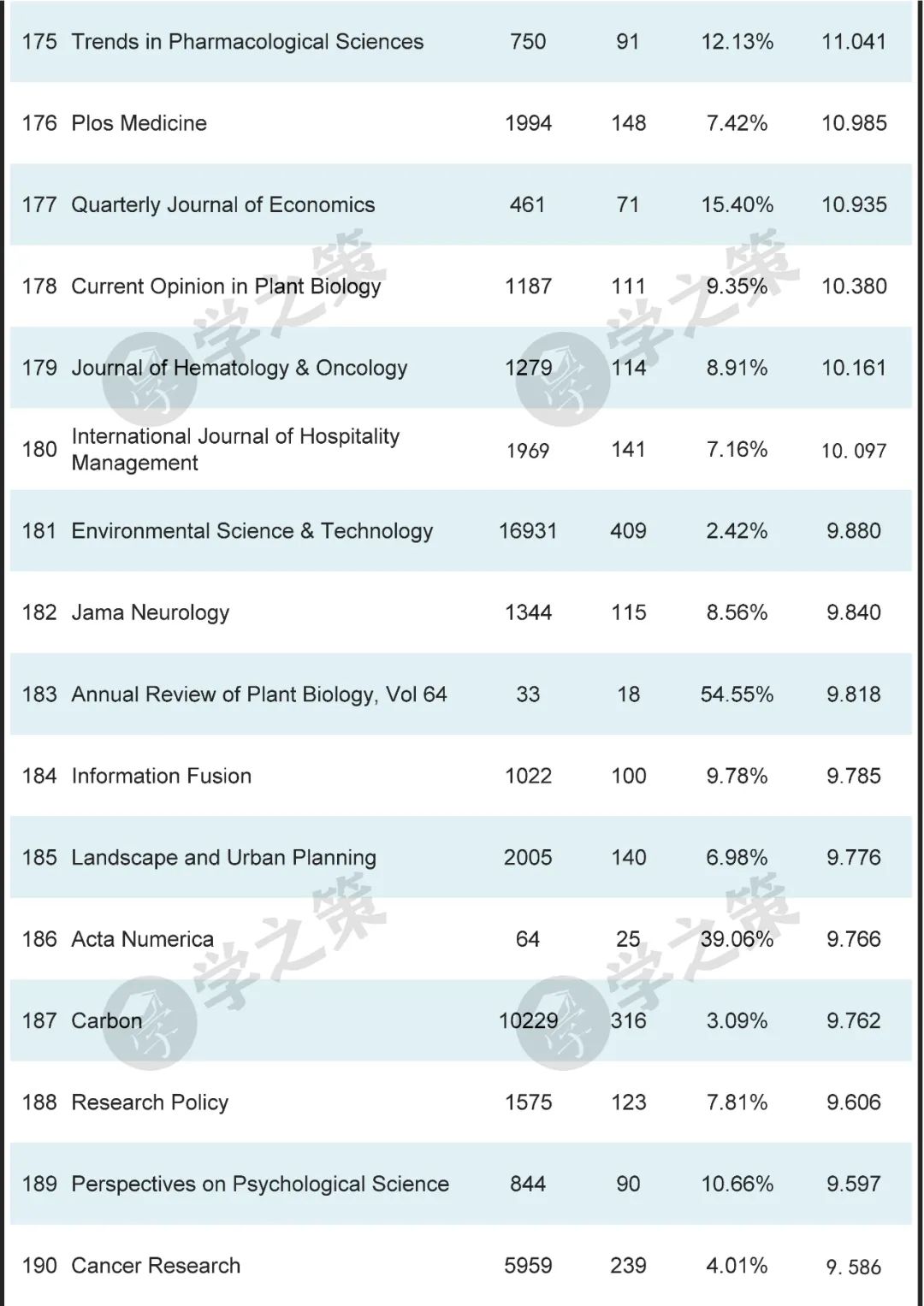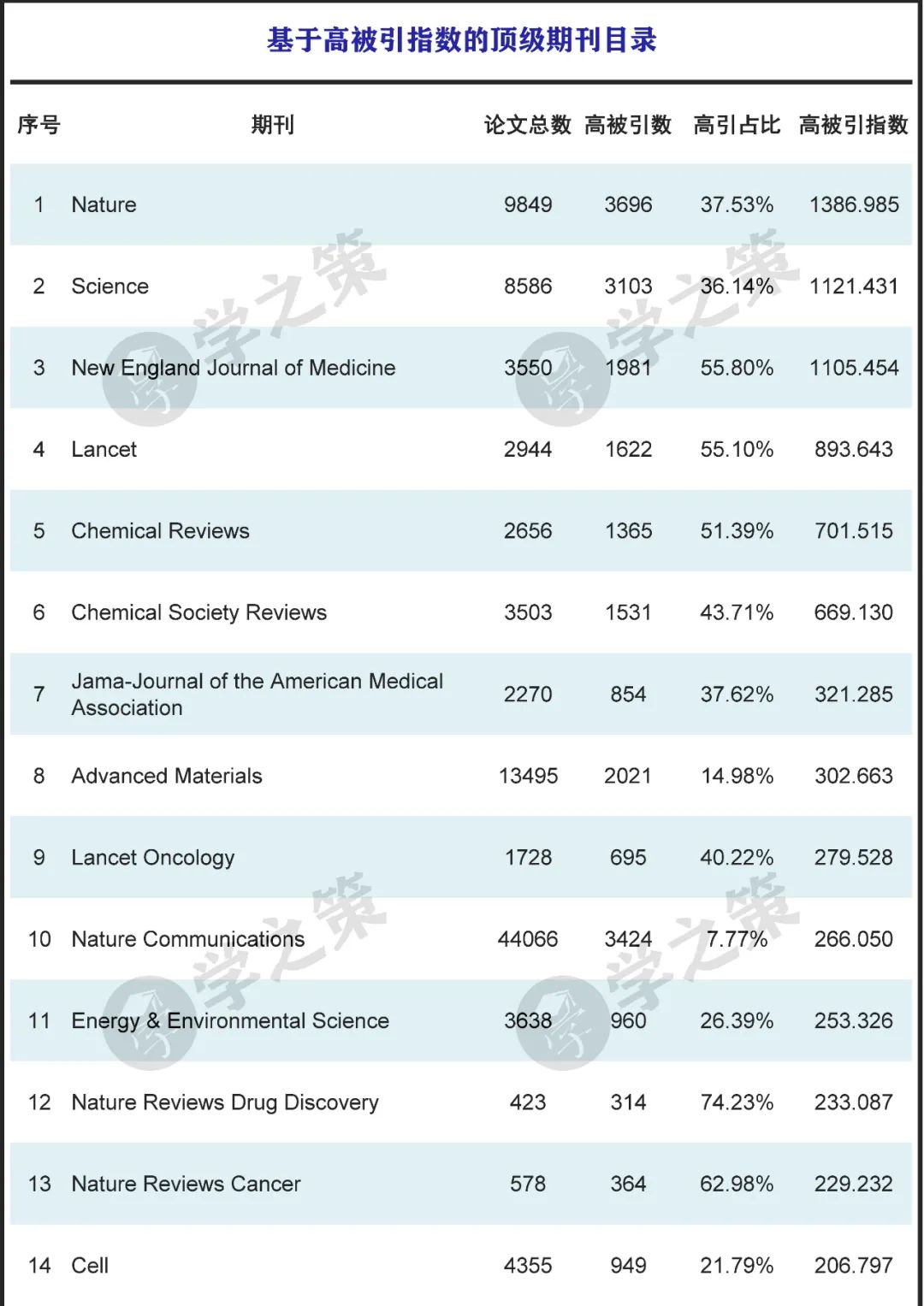 按照这种高被引指数,近万本期刊中,Nature排名第一,Science排名第二,这是符合常识的。和NS并称的Cell排名也不低,位列第14。